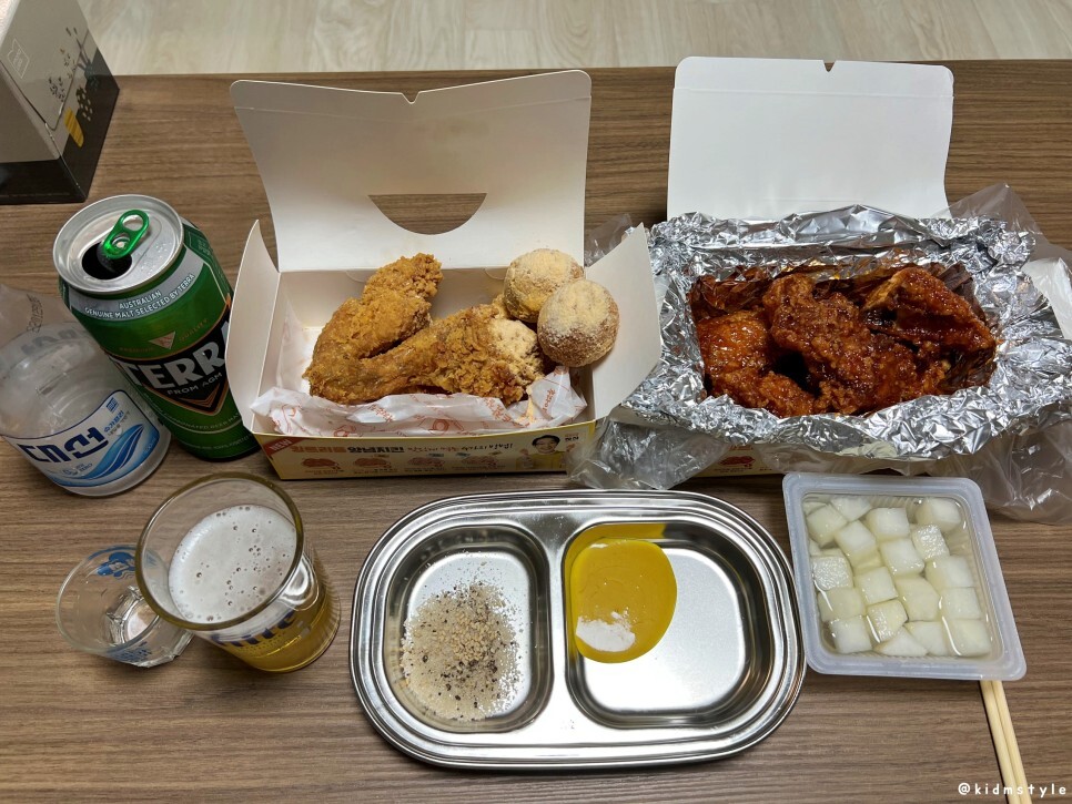 치킨에 소주만 먹기에는 아쉽고 맥주만 먹는 것도 아쉬우니 늘 소맥으로 마시게 된다. 키드엠 표 소맥은 언제나 맛있다. 소금과 머스터드소스까지 앞접시에 깔아놓으니 제법 잘 차려진 술상이 된다.