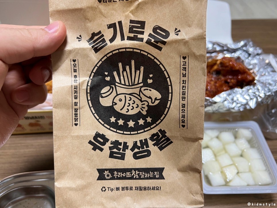 리뷰 이벤트로 받은 치즈볼이 들어가 있는 봉투이다. 슬기로운 후참생활 옛날 어릴 때 아버지가 사 오시던 통닭 봉투가 생각난다. 오늘은 tip에 적힌 것처럼 뼈 봉투로 활용할 예정.