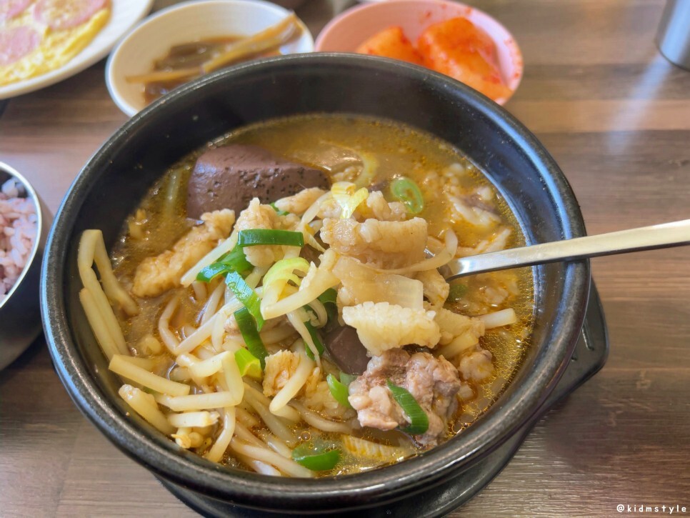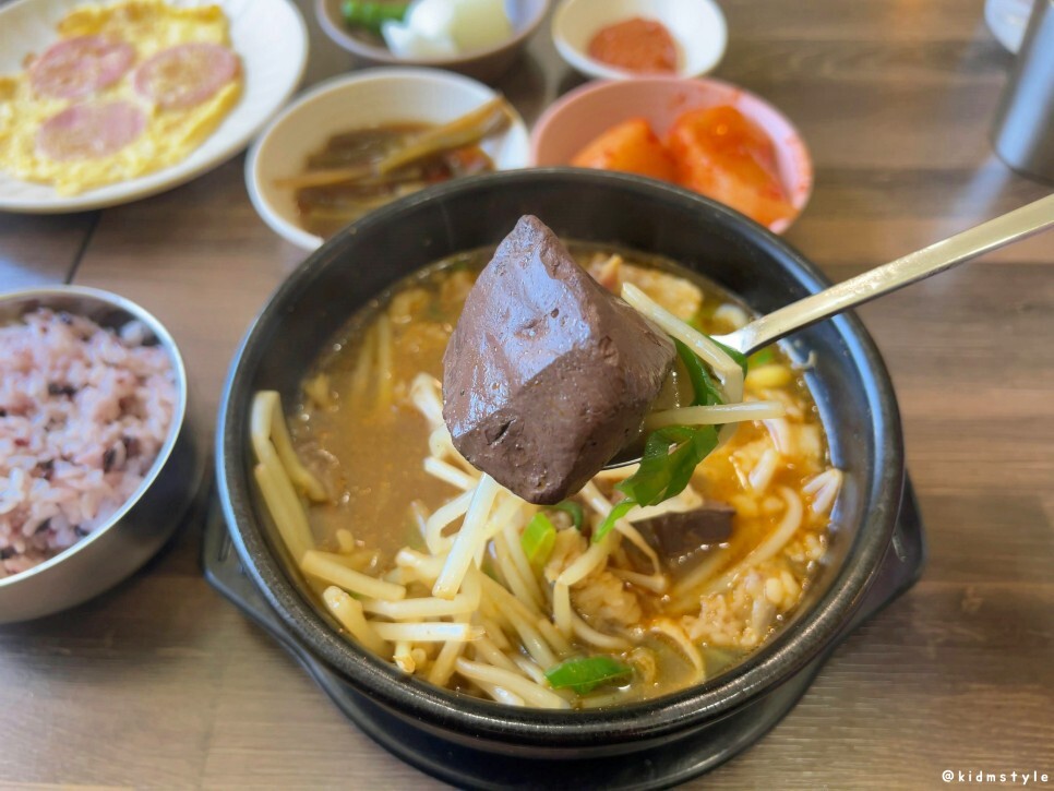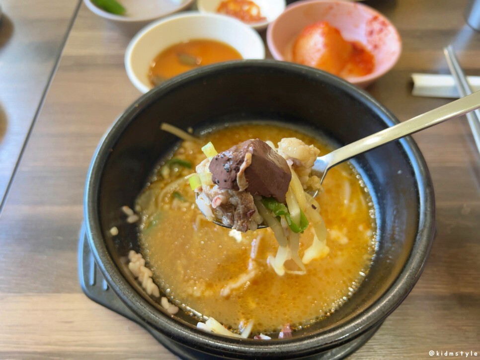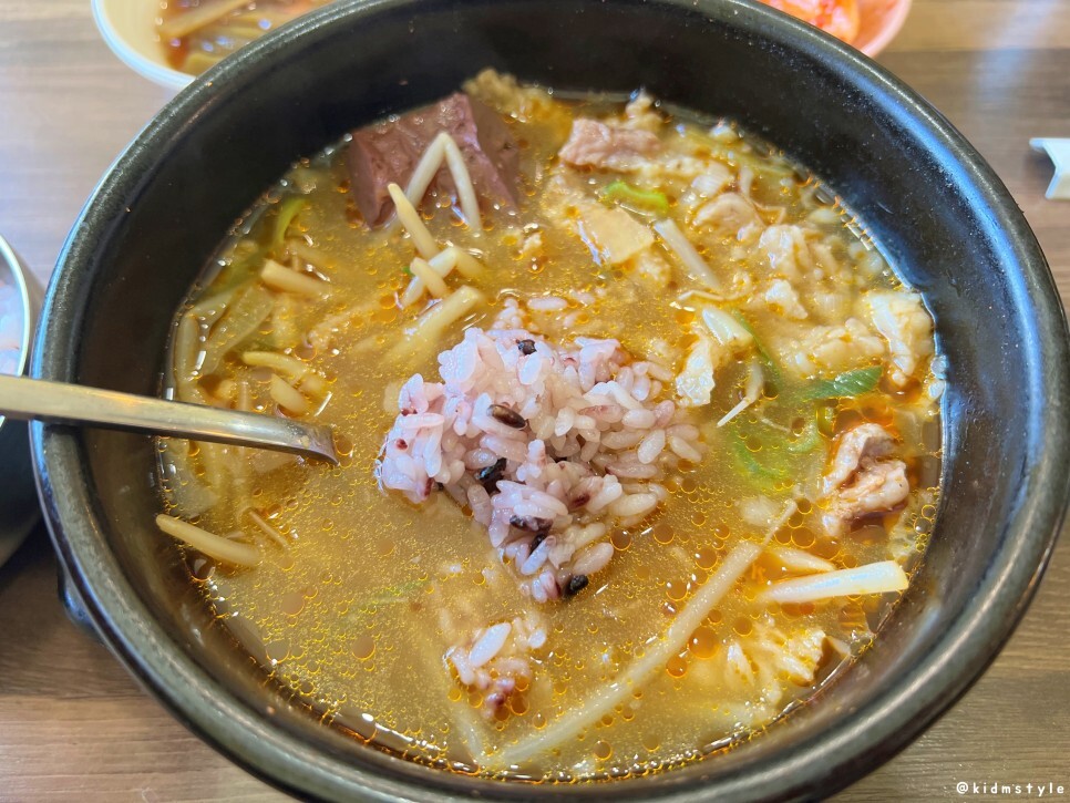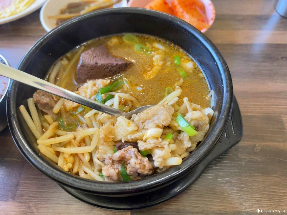선지가 두 덩어리 들어가 있는데 선지를 먼저 맛보니 잡내가 없고 퍼석퍼석하지 않은 깔끔한 선지이다.