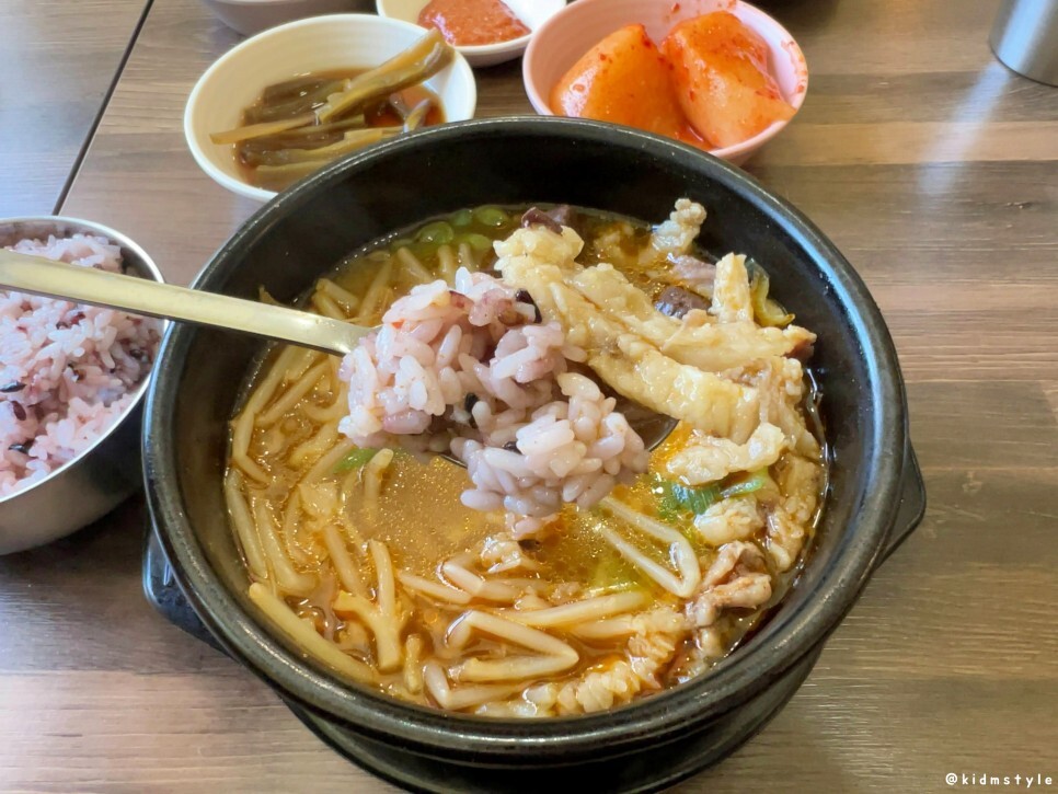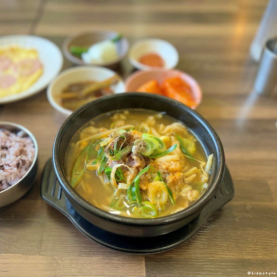 밥과 수구레국밥이 나왔다. 밥을 보니 흑미가 섞인 잡곡밥이네. 개인적인 경험으로 잡곡밥을 제공하는 식당은 맛이 없는 경우가 거의 없다. 나도 집에서 매번 잡곡밥을 해먹는 입장이라 흰쌀밥보다는 잡곡밥이 훨씬 반갑다.