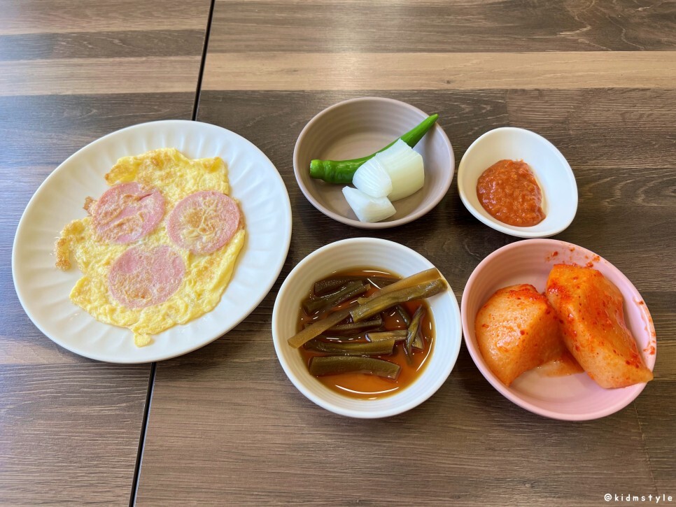 기본 상차림이다. 인스타그램 이벤트를 하면 분홍소시지를 한 접시 준다고 하는데 기본으로 3개는 나온다. 고추, 양파, 쌈장, 섞박지, 궁채 등이 나온다.