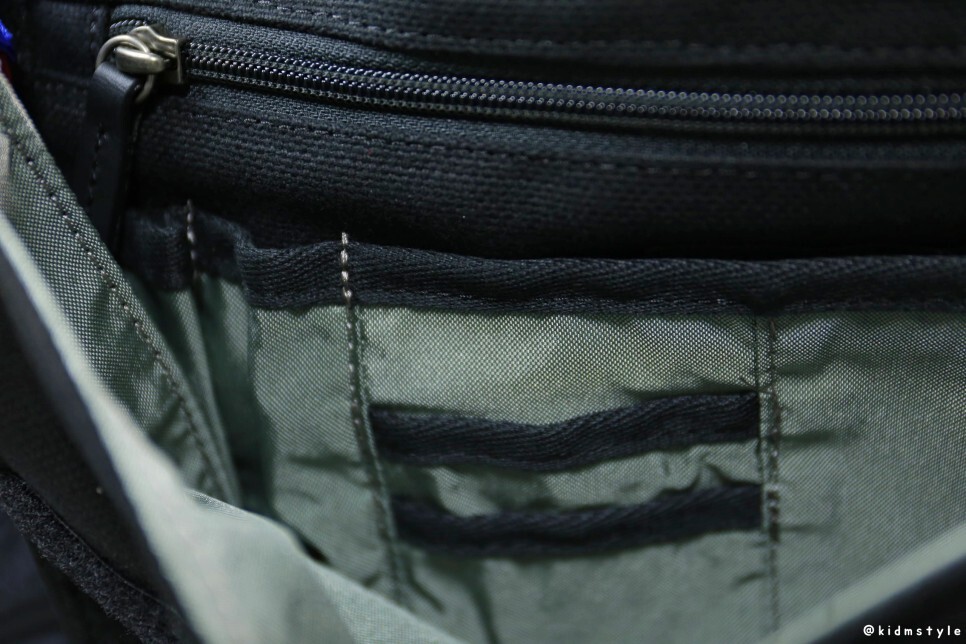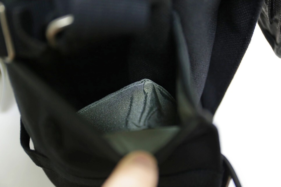가방을 메면 옆구리나 등판에 닿는 안쪽은 보다시피 깔끔한 디자인이다. 이 제품은 미니멀한 디자인이 매력 포인트인 것 같다. 너무 투박하고 특징이 없다고 말하는 사람도 있는데 실제 가방을 써보니 상당히 마음에 들더라.
