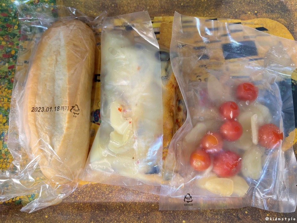 본격적으로 먹기 위해 포장을 꺼내보았다. 바게트 빵, 새우, 채소 순이다.