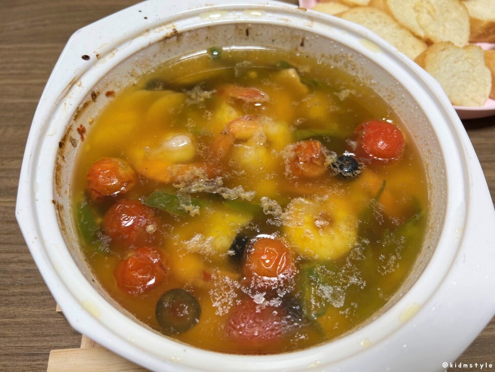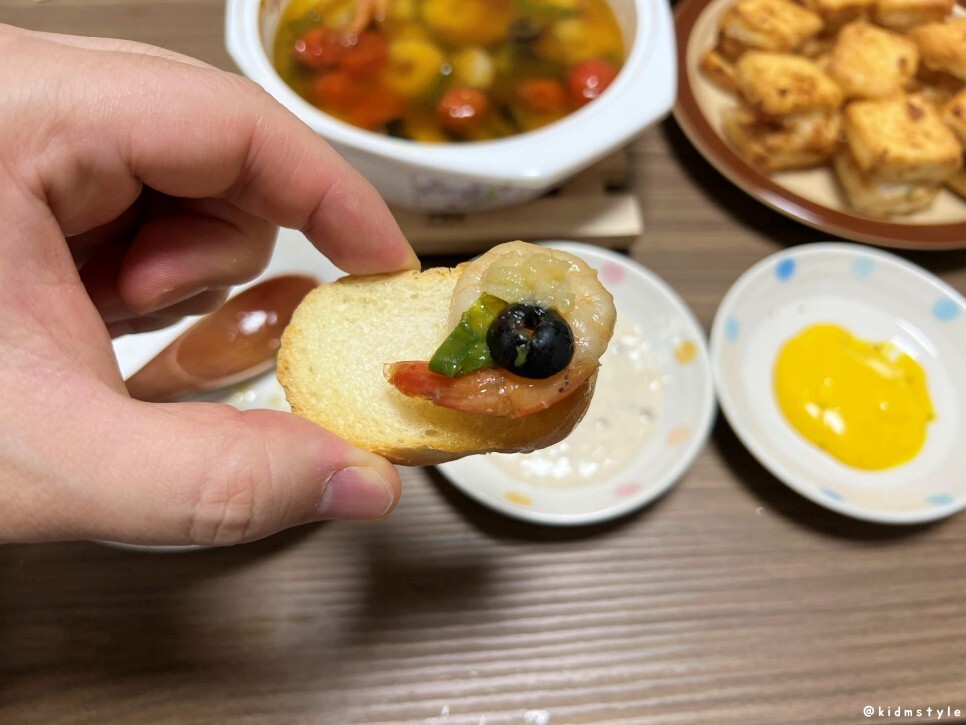 올리브오일에 푹 담근 바게트 위에 새우와 올리브를 올리고 맛본다. 맛이 괜찮다. 와~하고 눈이 번쩍 뜨일 정도는 아닌데 무난하게 먹기 좋은 것 같다. 마늘 등 재료를 더 추가해서 먹는 것도 괜찮은 방법이겠다.