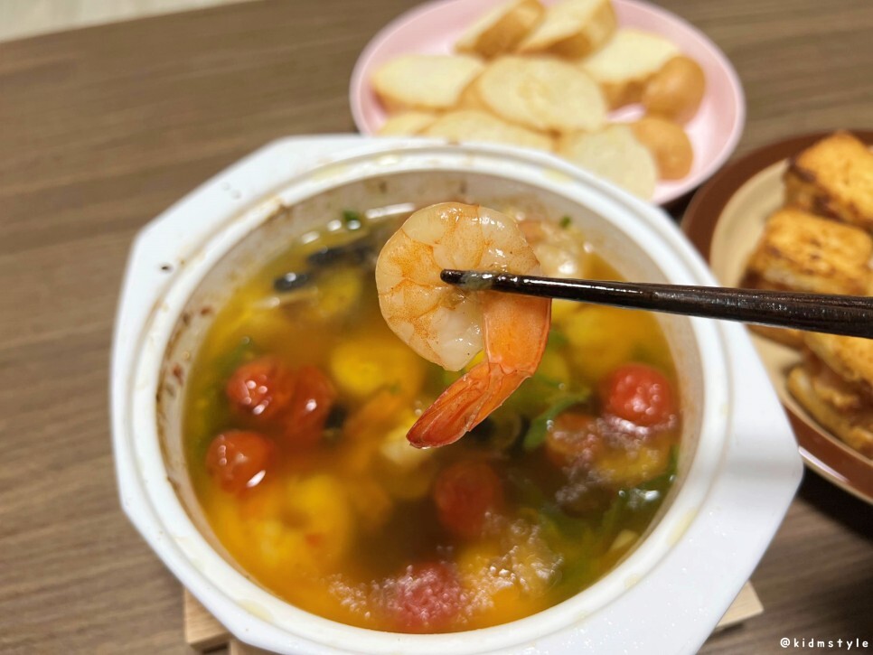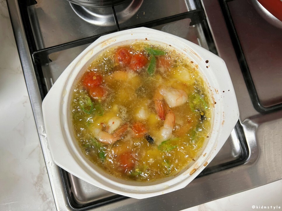 감바스는 해동 후 팬에 소스팩과 야채팩을 넣고 새우가 타지 않게 저어가면서 8~10분간 충분히 익혀주면 된다.