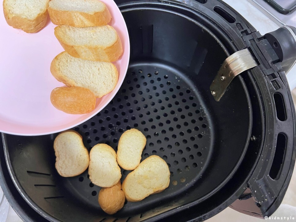 바게트는 에어프라이어에 200도, 3분 정도 노릇하게 구워주면 된다.