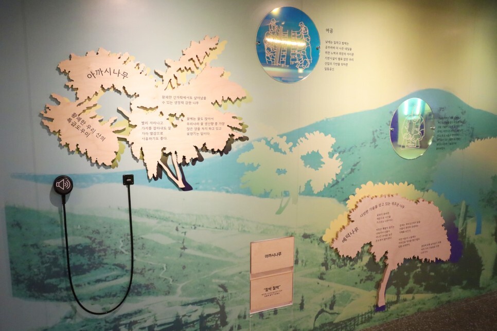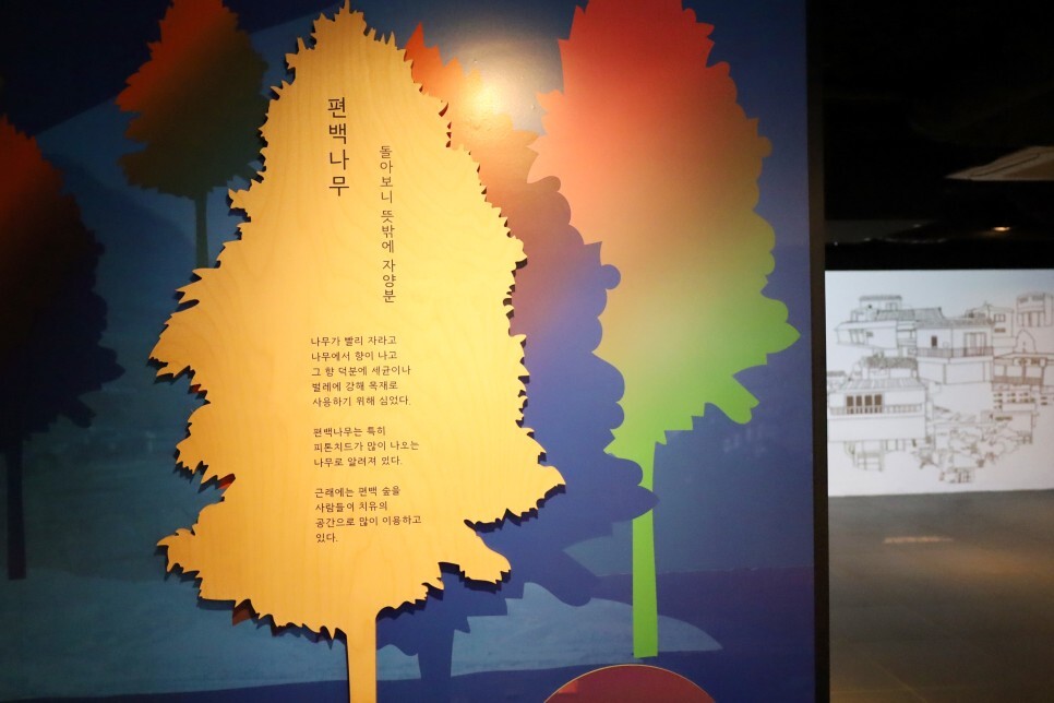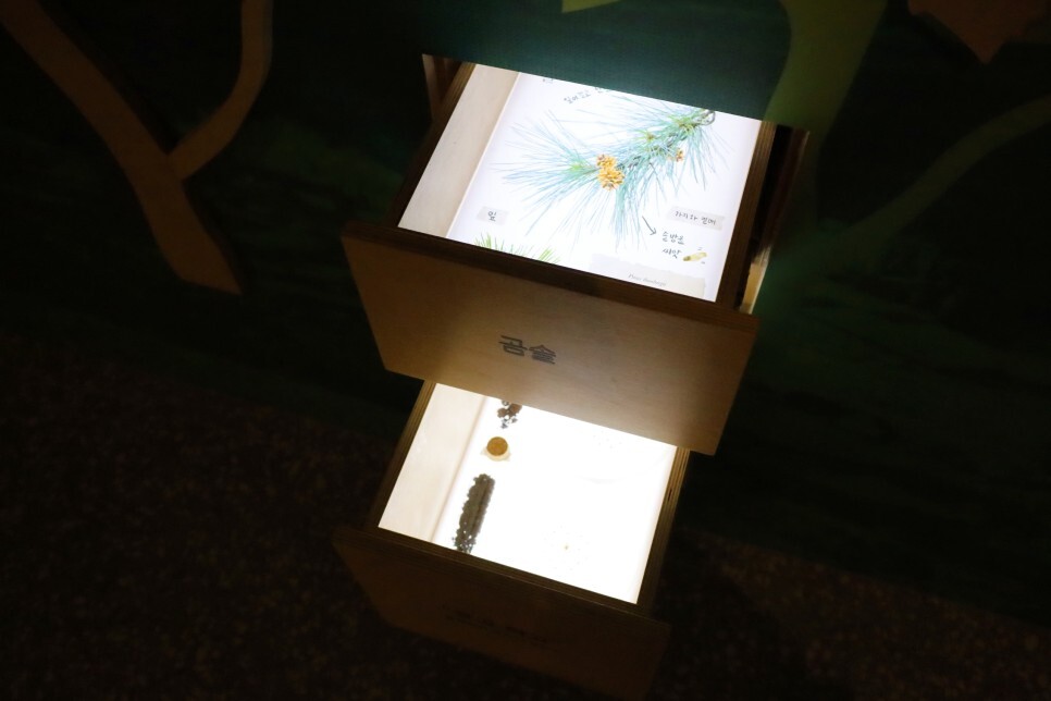 서랍을 하나씩 열어보면 나뭇잎과 씨앗을 만날 수 있습니다. 일제강점기 때 민둥산이었던 뒷산을 주민들의 노력으로 울창한 숲을 가꾸기까지의 노력을 떠올려 볼 수 있었습니다. 그곳은 이제는 힐링의 공간이 되었습니다.