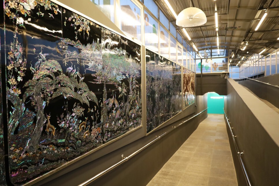 전시관으로 들어가는 입구부터 자개로 만든 아주 멋진 조형물들이 반깁니다. 부산 바닷가에 가면 쉽게 볼 수 있는 갈매기들이 흔들흔들 맞이하네요.