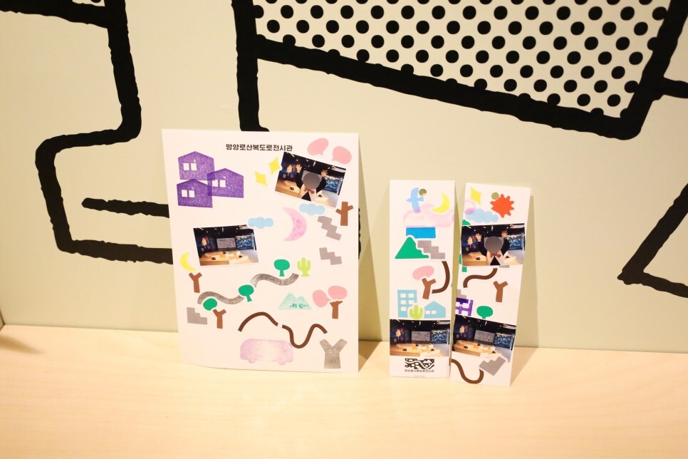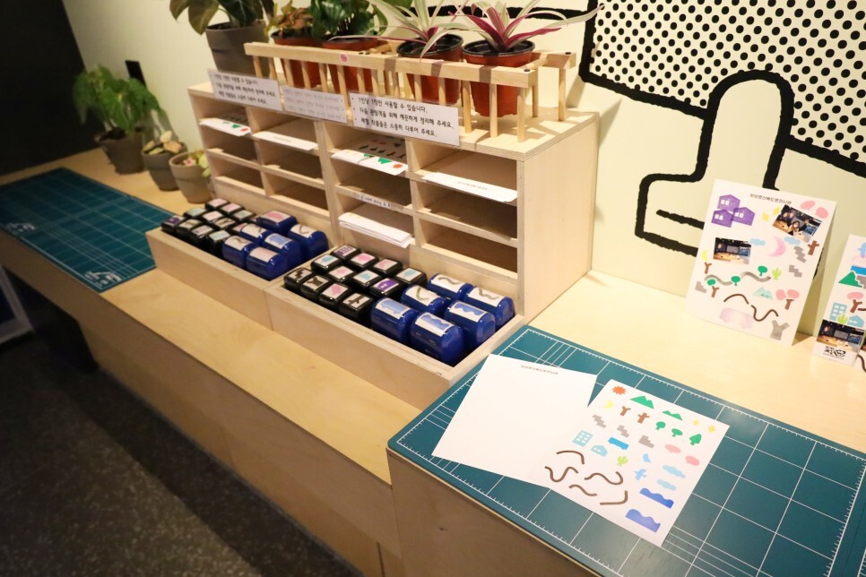 전시관을 열심히 구경하다 보면 한쪽 구석에서 기념품 공간을 만날 수 있습니다. 빈 종이에 산복도로를 나타내는 집, 산, 하늘, 길 등 다양한 모양의 스탬프를 이리저리 찍으면서 나만의 그림을 완성할 수 있습니다.