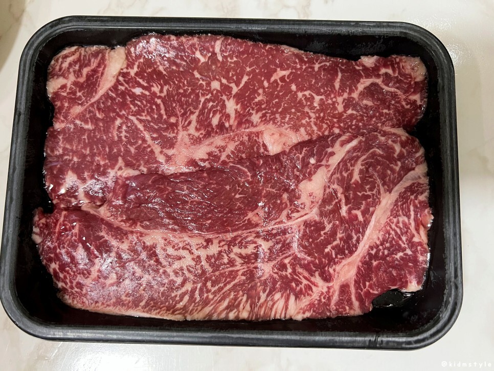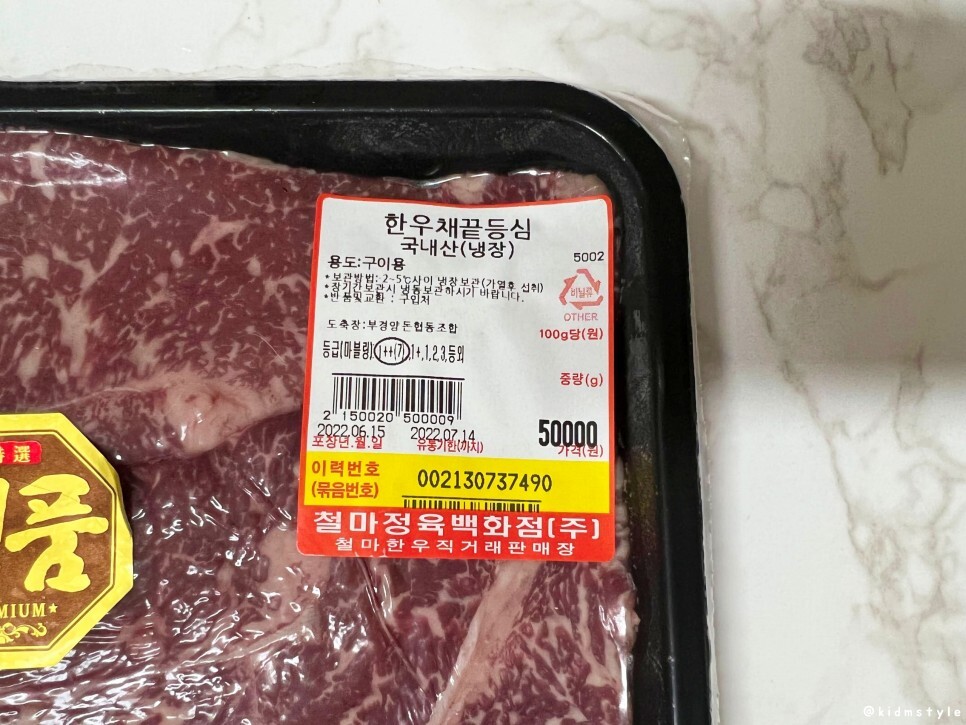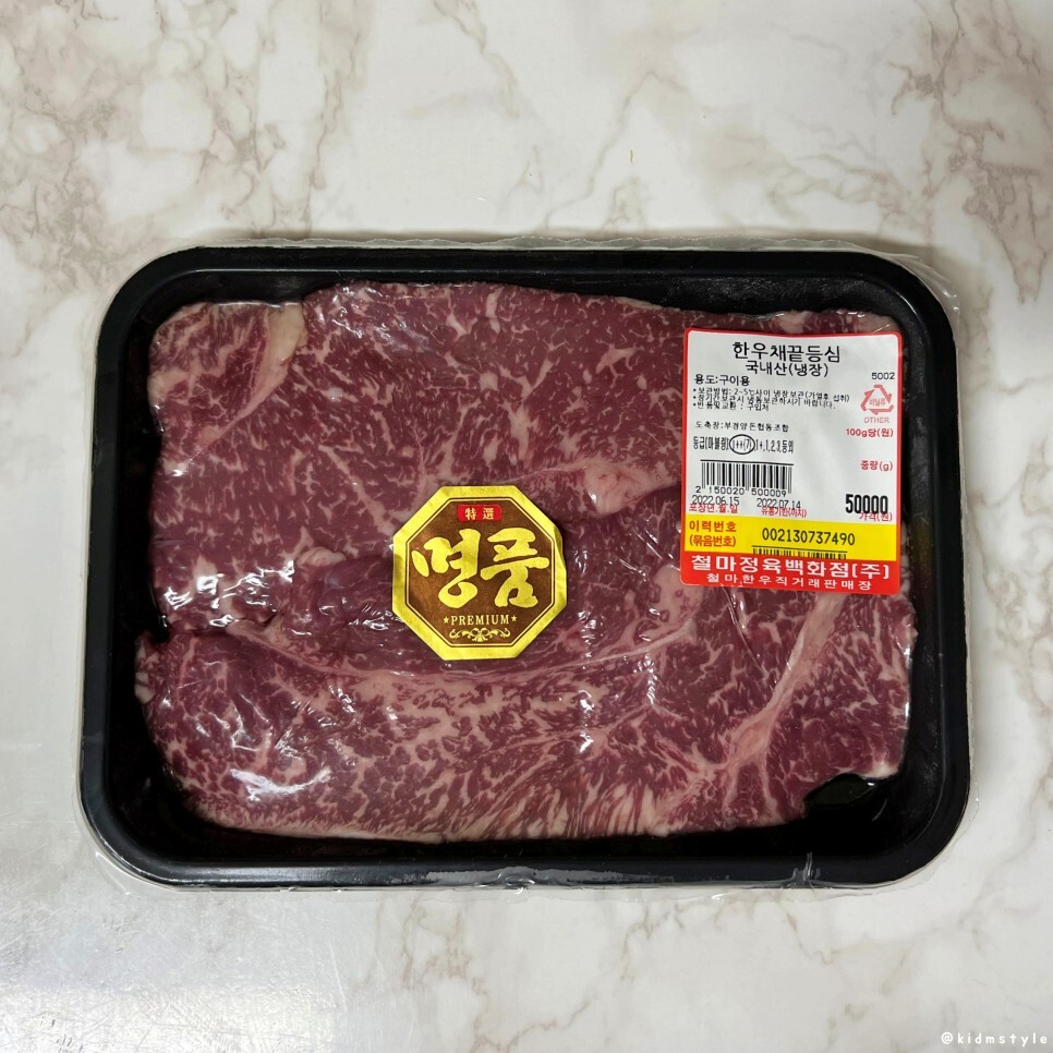 한우채끝등심이라는 타이틀, 등급은 1++ 투뿔, 가격은 5만 원이다. 개인적인 생각으로 한우를 고집하려면 투뿔 등급을 먹어야 된다고 생각하고 그 이하 등급보다는 미국산이 낫다고 생각한다. 흔히 수입산 중에서 호주산이 최고라고 생각하는 사람이 많은데 미국산 등급 높은 소고기가 훨씬 낫다. 물론 육류 유통 현업 지인에게 시간 날 때마다 듣는 얘기를 적어보았다.