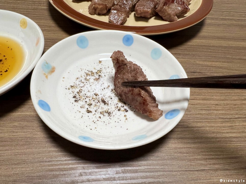 아무것도 찍지 않고 한 점 맛보니 예상한 대로 아주 맛있다. 이어서 소금에도 살짝 찍어서 맛본다.