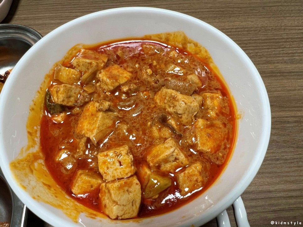 잠시 이야기가 삼천포로 샜다. 고추장찌개가 생각했던 것보다 상당히 무게감이 있는 모습이다. 상당히 진한 고추장을 사용한 것 같다.