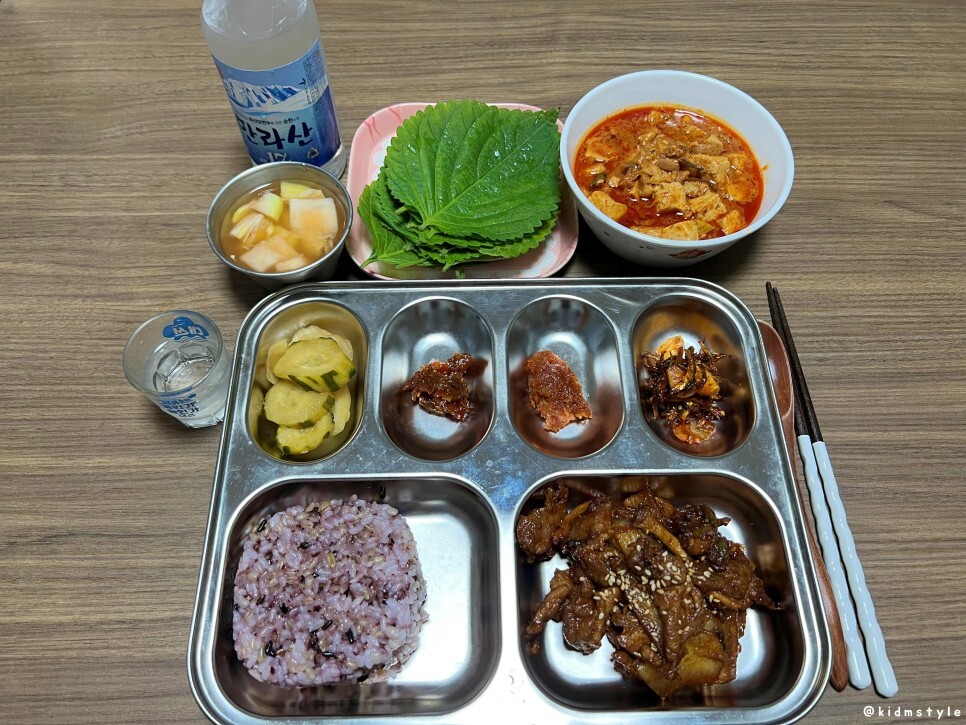 반찬은 엄마표 시원한 동치미, 깻잎, 고추장찌개, 오이지, 매실장아찌, 쌈장, 고추장 멸치볶음, 잡곡밥, 돼지고기 불고기 되겠다.