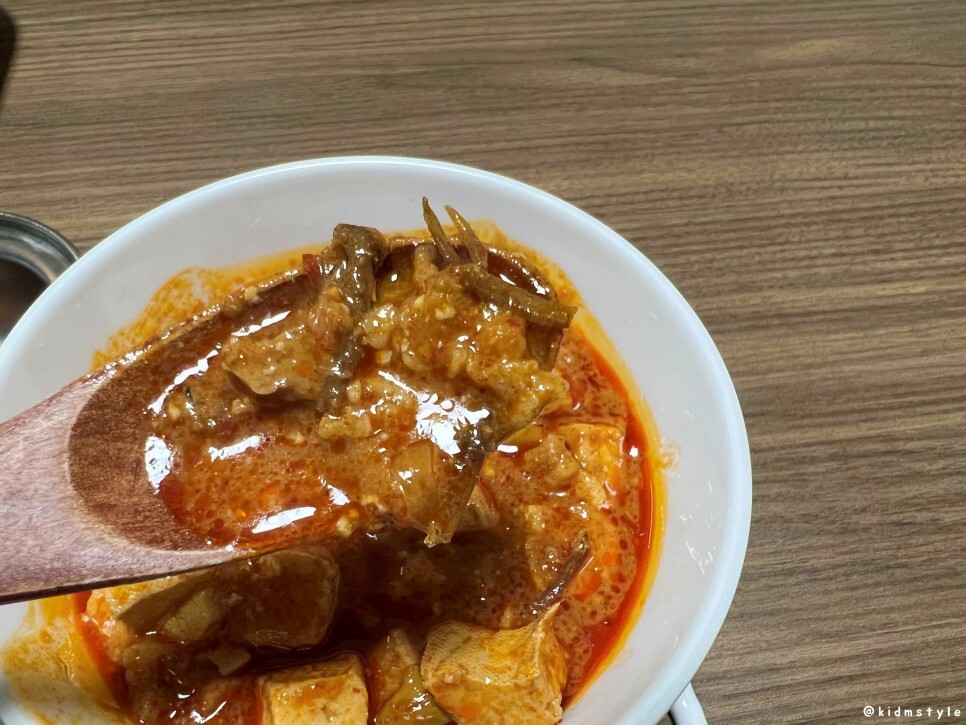 멸치가 주는 여운이 크기 때문에 푹 퍼진 멸치찌개의 그 멸치를 못 먹는 사람에게는 조금 접근하기 힘든 찌개가 될 수도 있겠지만 대부분은 아주 맛있게 즐길 수 있는 참 맛있는 찌개이다.