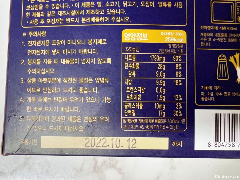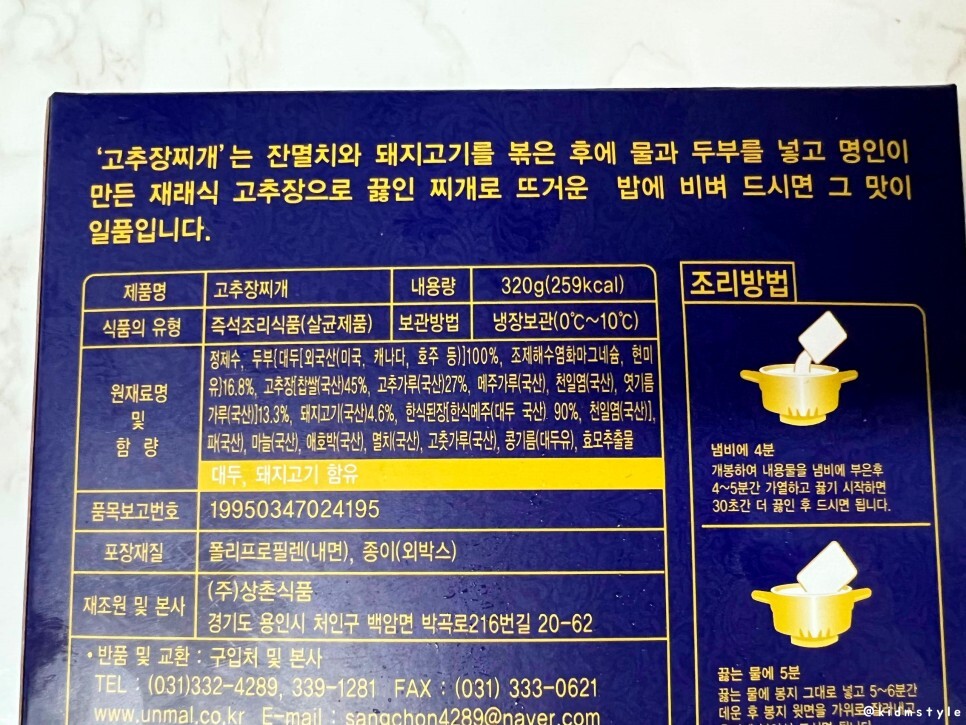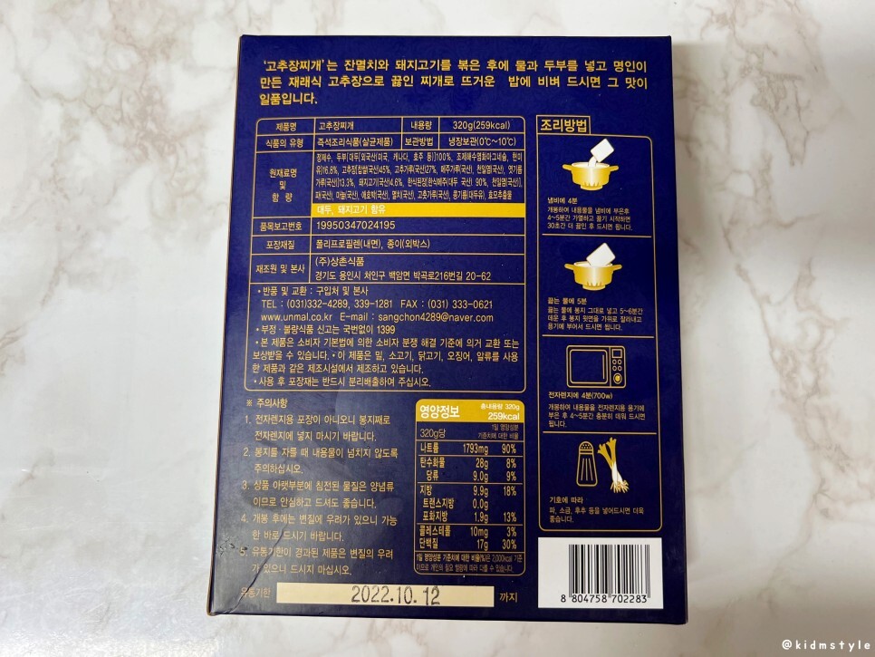 그리고 아래에 원재료 및 함량 참고. 조리방법은 간단하다. 개봉해서 냄비에 넣고 끓이면 된다. 끓는 물 중탕, 전자레인지 조리법도 있다.