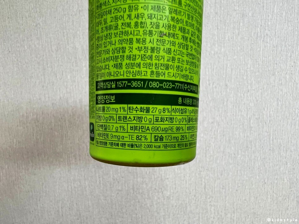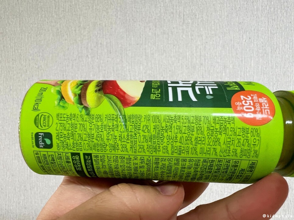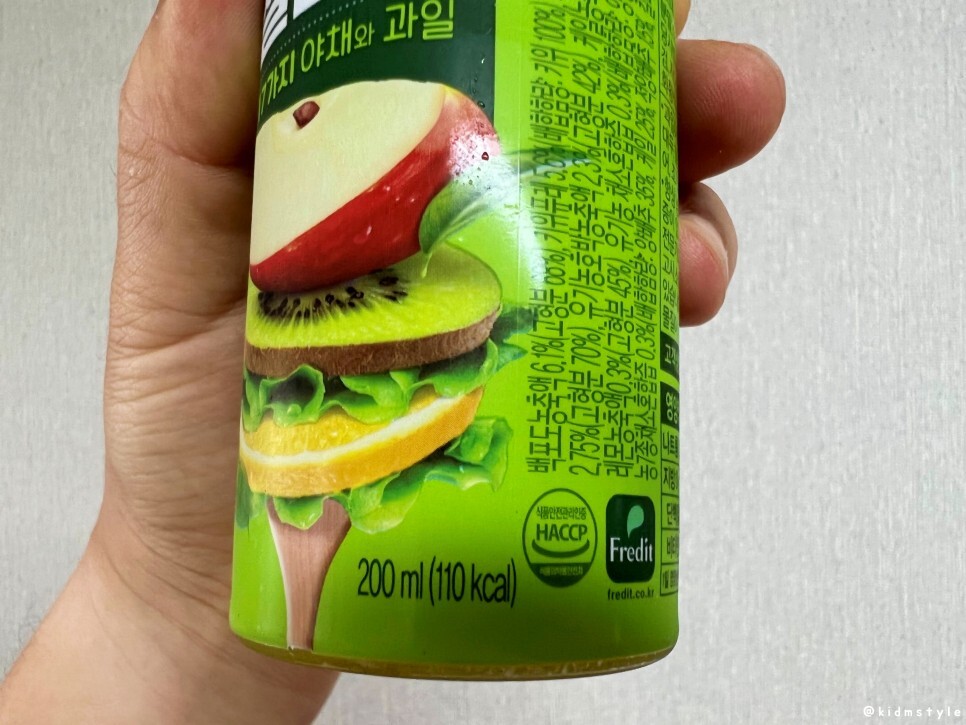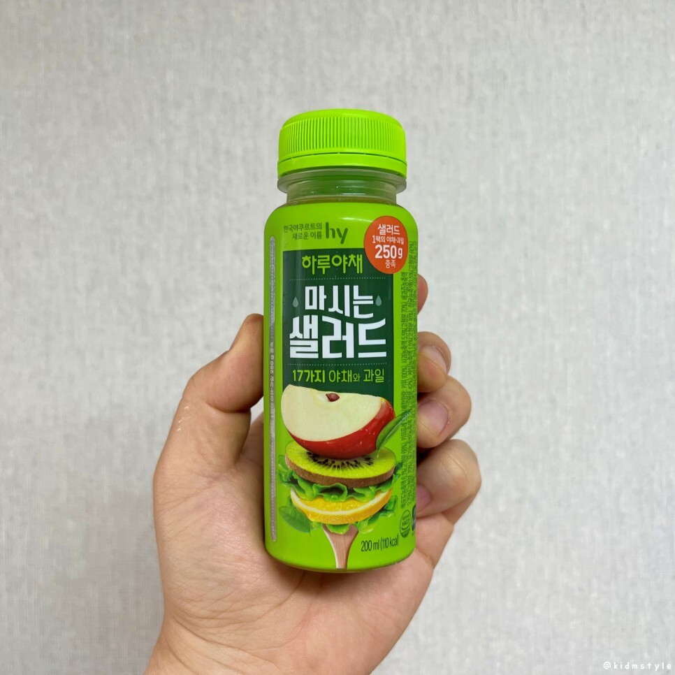 사과, 키위, 오렌지 등과 녹색 채소 등 다양한 것들이 들어간다. 200ml, 11kcal이다.