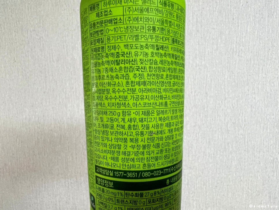 백포도, 키위퓨레, 사과, 배과즙, 유기농호박, 케일, 청귤, 레몬, 양상추, 셀러리, 시금치, 양배추, 적양추, 칼리플라워, 미나리, 신선초, 청피망 등 다양한 과일과 채소가 들어가 있다. 몸에 좋겠다.