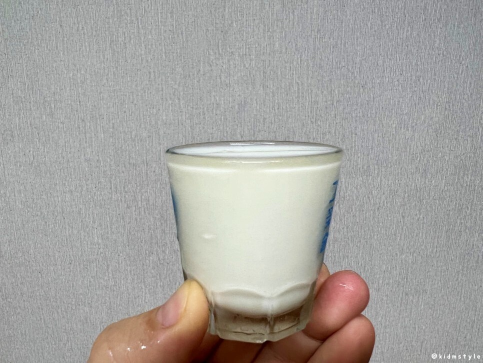 리뷰를 위해 소주잔에 따라보았다. 색깔은 완전 흰색은 아니고 약간 누런 느낌이다. 아 참, 먹기 전에 한번 쉐킷쉐킷 흔들어서 먹는 것을 추천한다. 맛은 플레인 요거트 맛인데 상당히 부드럽고 진한 느낌이라 너무 마음에 든다. 산양유가 들어가 있다고 하니 뭔가 더 진한 것 같기도 하고 그렇다.