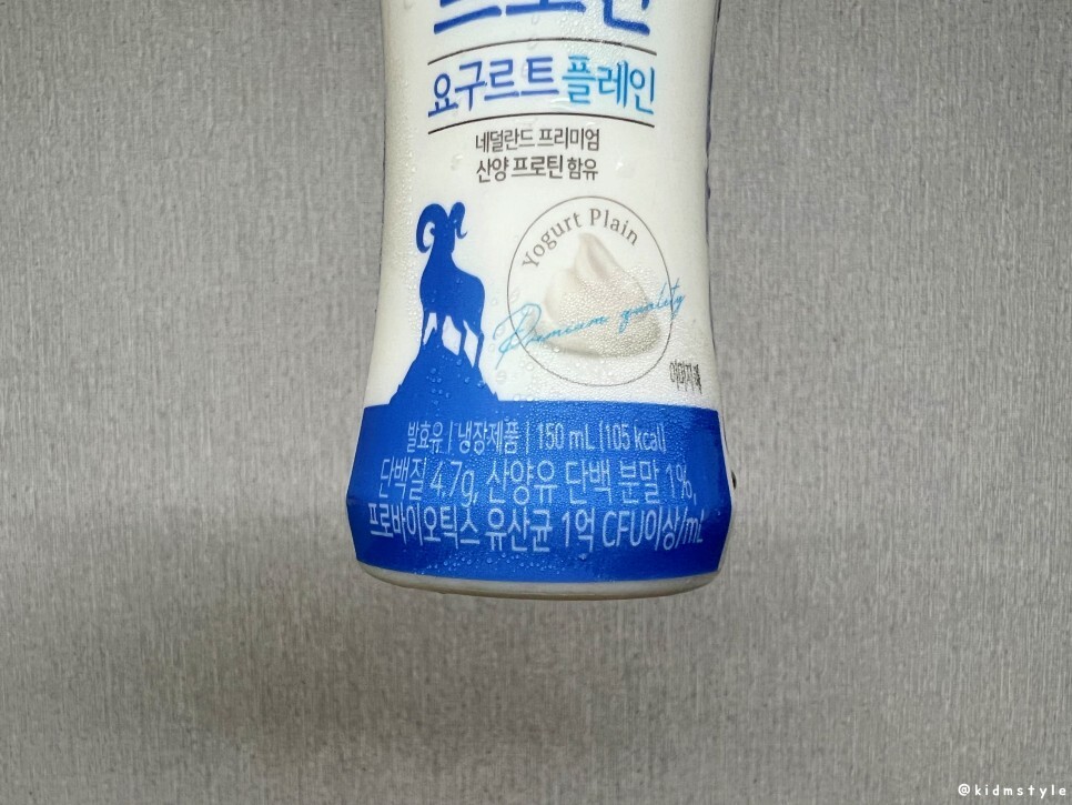 네덜란드 프리미엄 산양 프로틴 함유를 강조하고 있다. 발효유 냉장제품이며 150ml에 105kcal이다. 강조한 대로 단백질이 4.7g이나 들어가 있으며 산양유 단백 분말 1%, 프로바이오틱스 유산균이 ml 당 1억 CFU 이상 들어가 있다고 한다.