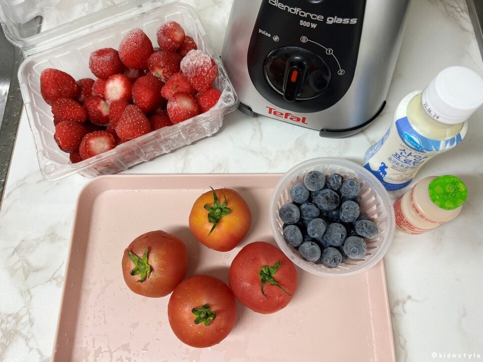 어느 날 아침, 아침식사 대신 과일주스를 갈아먹는 모습이다. 밥 차리는 것보다 훨씬 간단하기 때문에 과일주스로 아침을 시작하는 경우가 많다. 특히 이때가 6월 말이라 아침부터 상큼한 주스 한잔하면 하루가 시원했다.