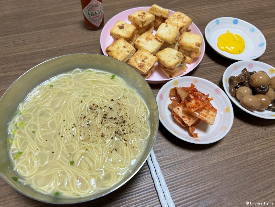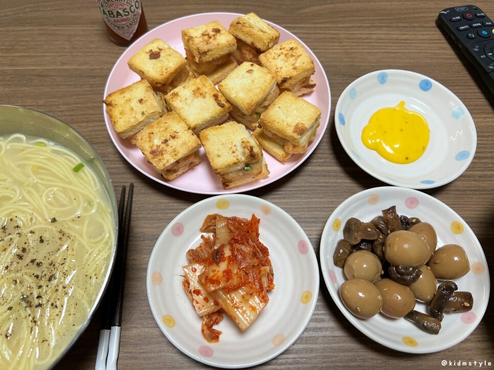 일전에 소개한 멘보샤, 타바스코 소스, 머스터드소스, 김치, 메추리알 버섯 조림까지. 메추리 반찬 어머니가 해주신 거 저게 정말 맛있었다. 엄마표 김치는 말이 필요 없고.
