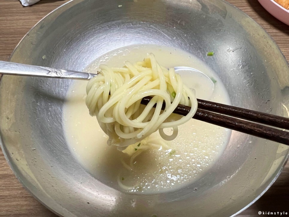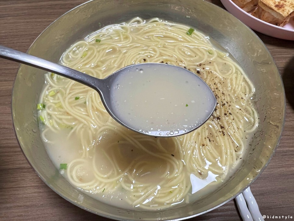 큰 기대를 가지고 국물을 한 숟가락 떠보니 기름이 생각 외로 약한 느낌이다. 그리고 맛을 보니 생각보다 아쉽다. 돈코츠를 느낄 수 있는 육향은 거의 없고 염도도 그리 높지 않다. 먹다 보니 사리곰탕면의 국물이 생각나네.
