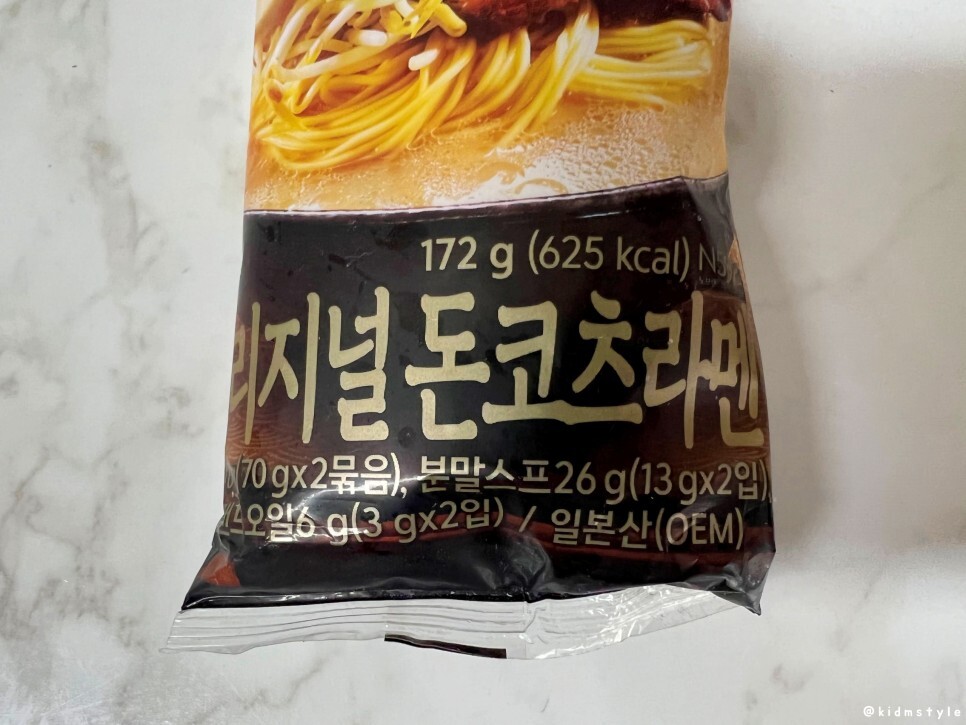 일본어로 오리지나루 돈코츠라멘이라고 적혀있다. 조리 예 사진은 상당히 맛있어 보이는데 과연? 아 참, 가격은 2,180원이다.