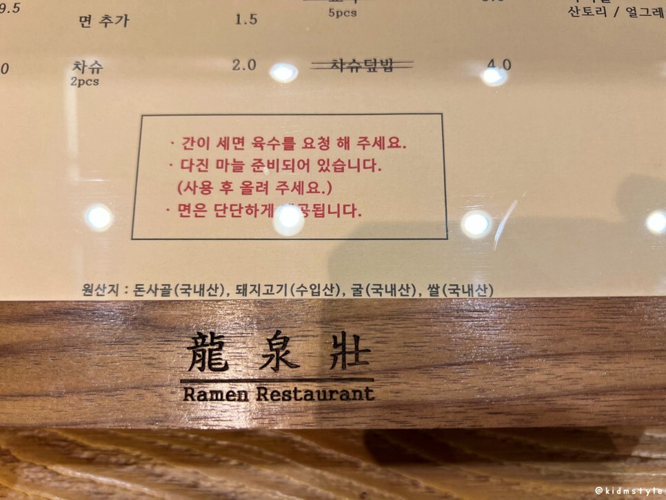 부산에서 일본 현지의 돈코츠라멘 맛을 고수하면서 영업을 이어가고 있는 라멘집들이 꽤 있는데 그곳들에 박수를 보내고 싶다. 짜다는 컴플레인이 걸려도 아랑곳하지 않고 그 맛을 고수하면서 열심히 개발하고 맛을 이어가고 있는 집들 말이다. 지금 라멘으로 인기 있는 집들이 다들 그렇다. 류센소 본점도 마찬가지이고. 사실 큐슈 현지에 가서 먹어보면 훨씬 더 짜다.