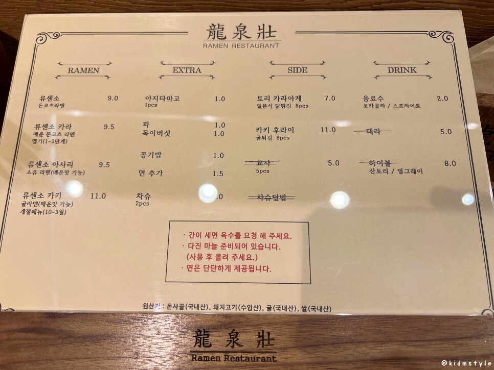 메뉴판인데 이미 류센소 다른 지점에서 자주 먹어봤기에 무난하게 돈코츠라멘인 류센소를 주문해 본다. 매운 돈코츠도 있고 소유라멘, 굴라멘까지 취급한다. 특히 지금 시기에 굴라멘은 별미로 맛볼 수 있다.
