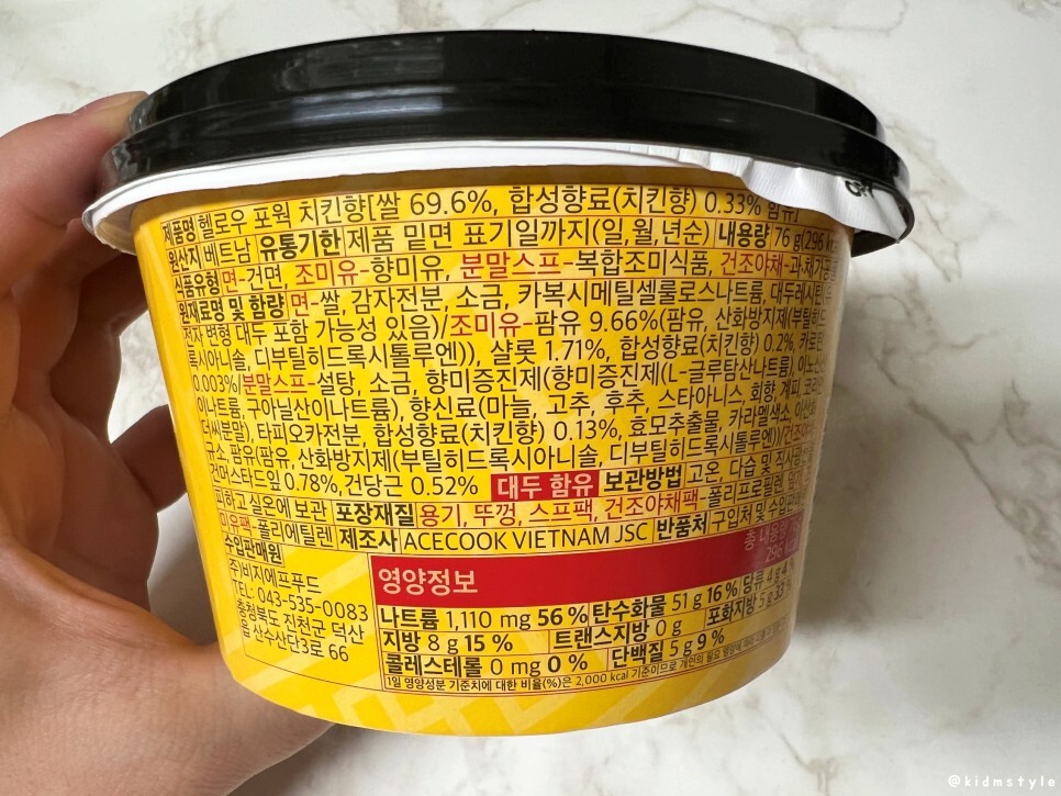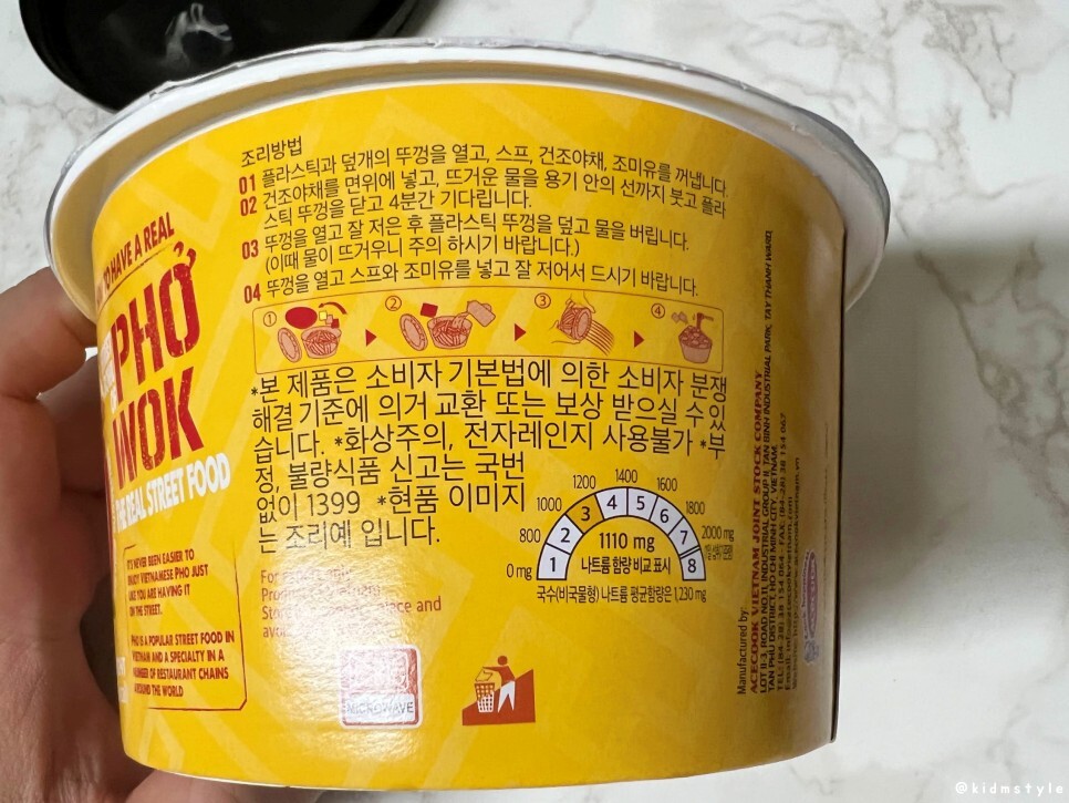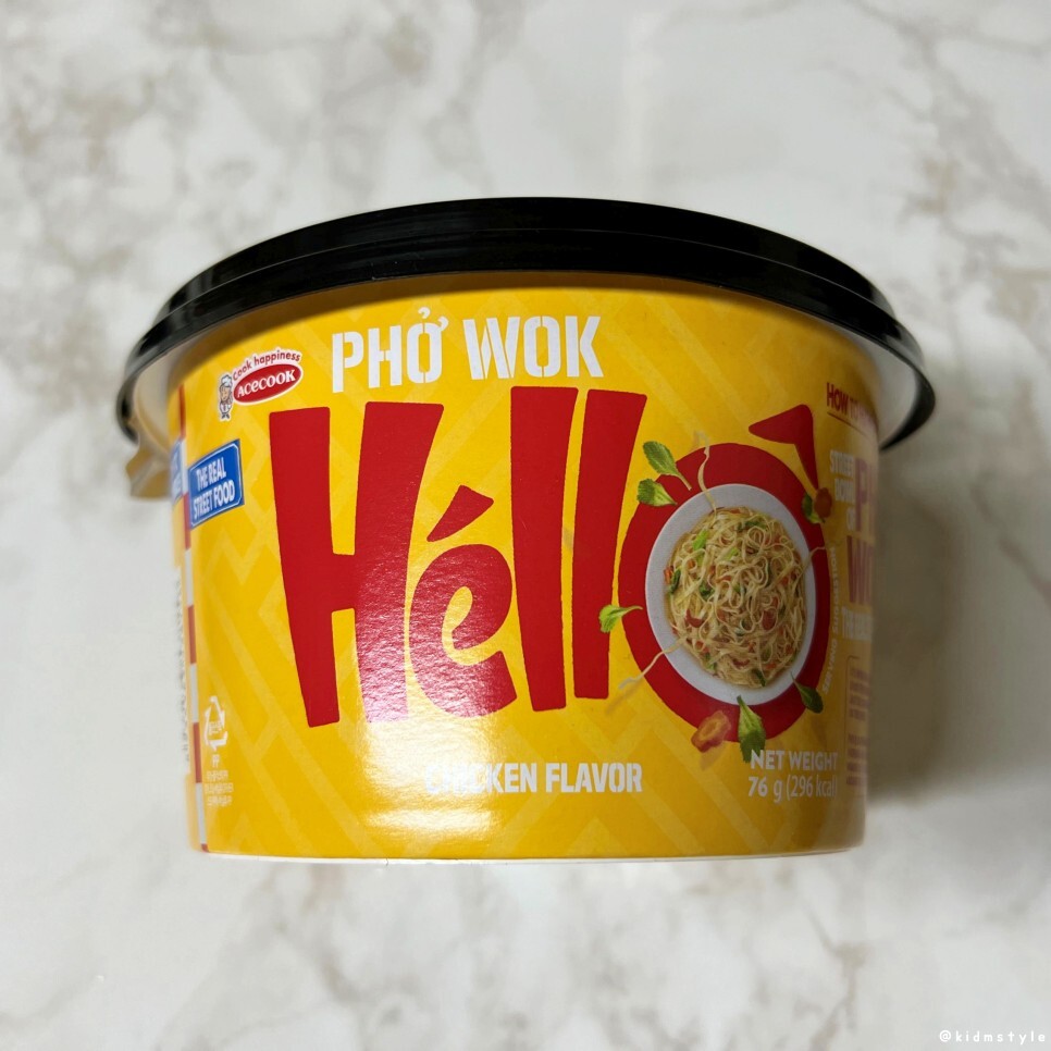 에이스쿡이라는 회사에서 나온 헬로우 포웍 치킨향이라는 볶음 쌀국수 컵면이다. acecook hello pho wok chicken flavor