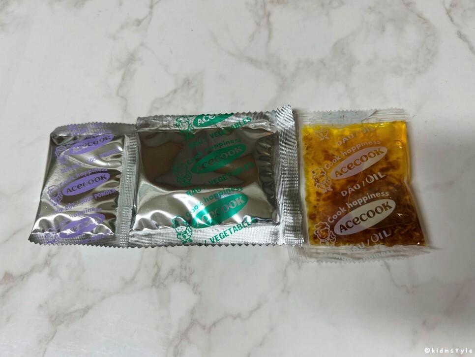 - 뚜껑을 열고 스프, 건조야채, 조미유를 꺼낸다.