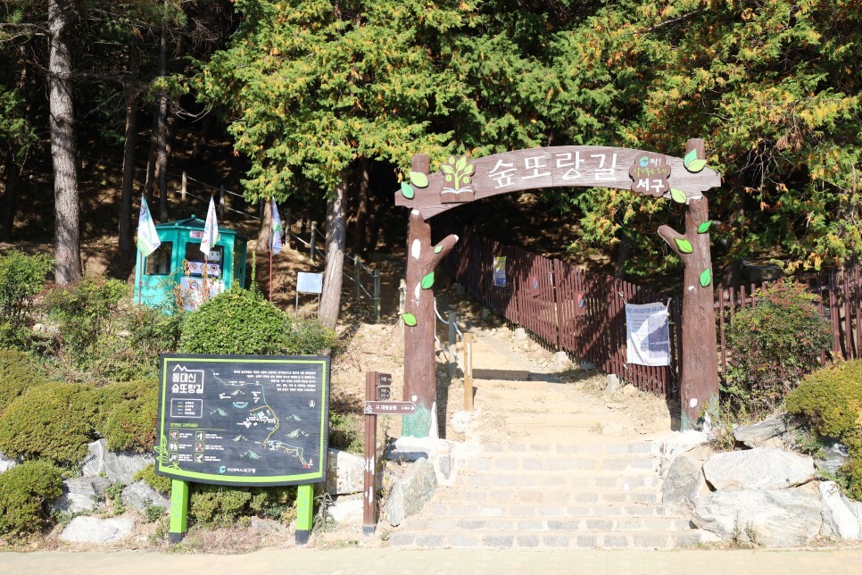 맞은편에는 서구 동대신 숲또랑길이라는 등산로도 만날 수 있습니다. 저희 집에서 가까운 뒷산이라 참 자주 걷는 길인데요. 숲또랑길이 잘 조성되어 있어서 가볍게 남녀노소 부담 없이 걸을 수 있는 길이랍니다.