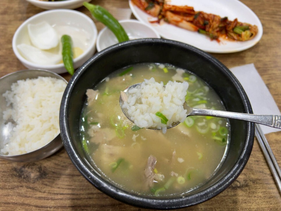 부드러운 고기 한 점 올리고 맛보니 참 좋네요. 투박하고 돼지 특유의 냄새가 풀풀 나는 시장 국밥 스타일을 좋아하는 제 입장에서도 상당히 깔끔하고 맛있게 다가오는 국밥입니다.