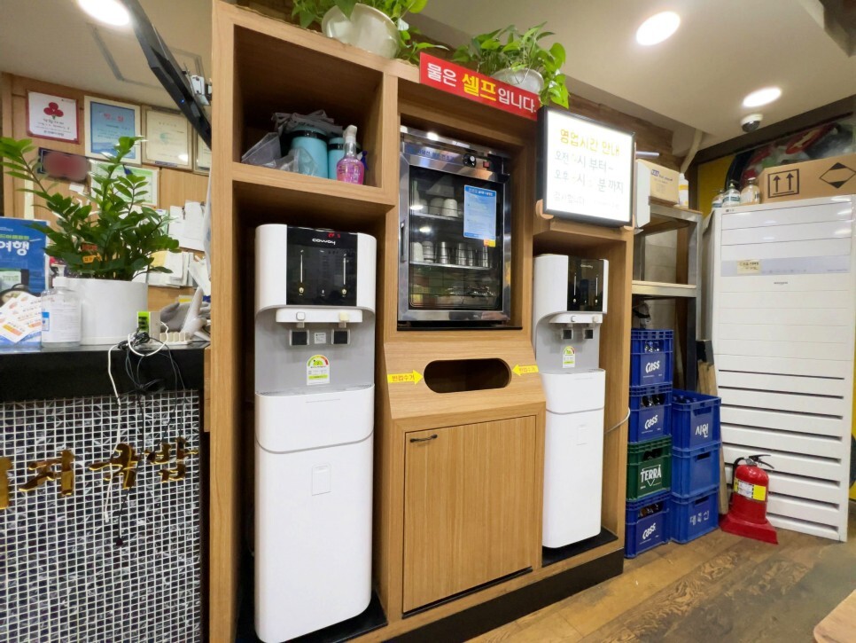 물은 셀프이며 정수기와 컵이 관리가 잘되고 있는 모습입니다.