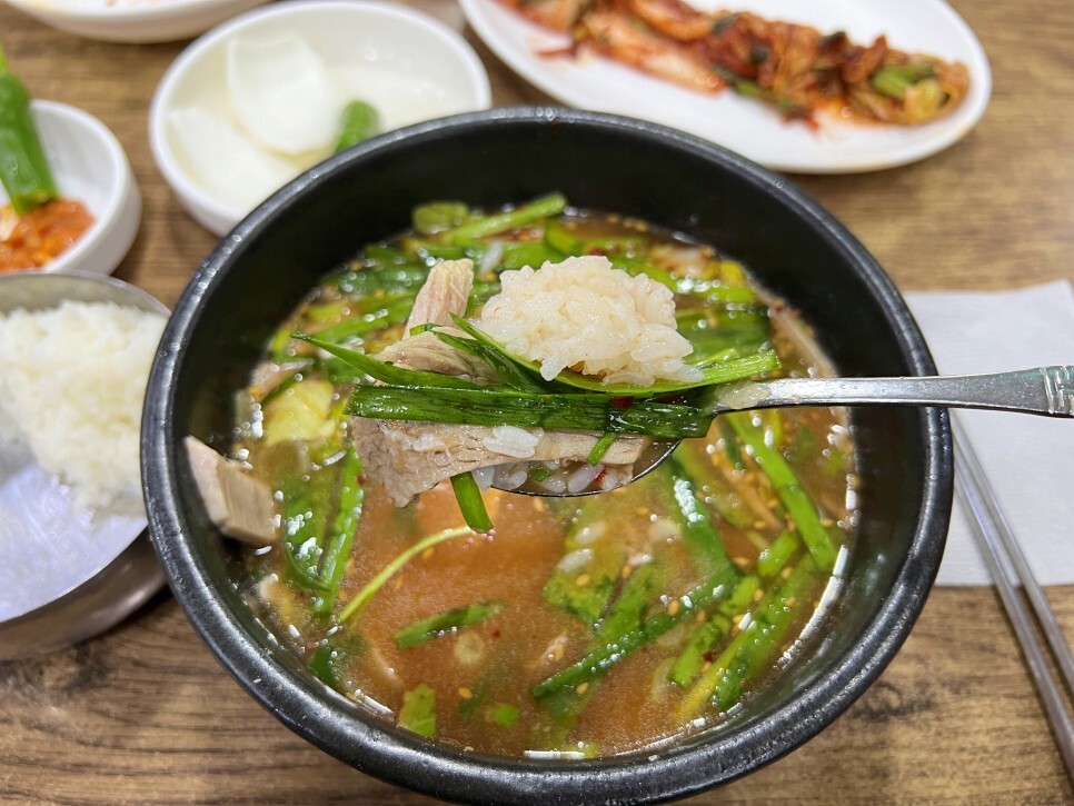 잘게 썬 파와 다진 마늘도 조금 들어간 것 같네요. 잡내를 잡기 위한 선택이죠. 돼지머리를 푹 우려내서 끓인 시장통 스타일의 국밥과는 다르게 사골을 우려냈습니다. 돼지 사골을 진하게 우려내고 누룽지 육수를 추가하여 고소함을 더한다고 합니다.