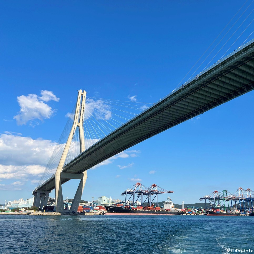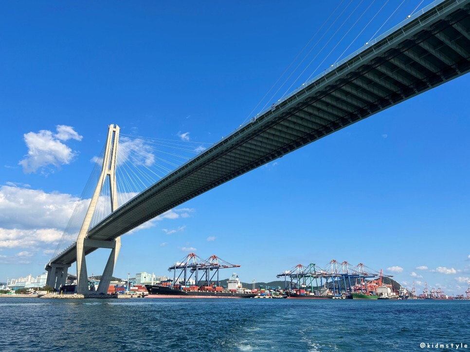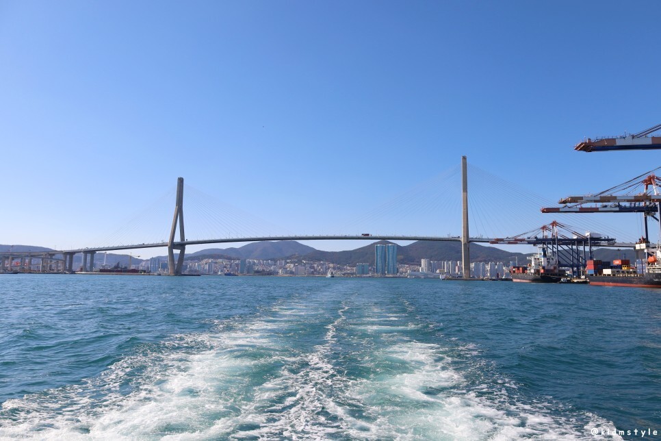 북항 일대를 크게 한 바퀴 돌고 돌아오면서 한 컷. 부산항대교는 커다란 크루즈 선박이 오갈 수 있도록 교각의 높이가 상당히 높게 건설되었다.