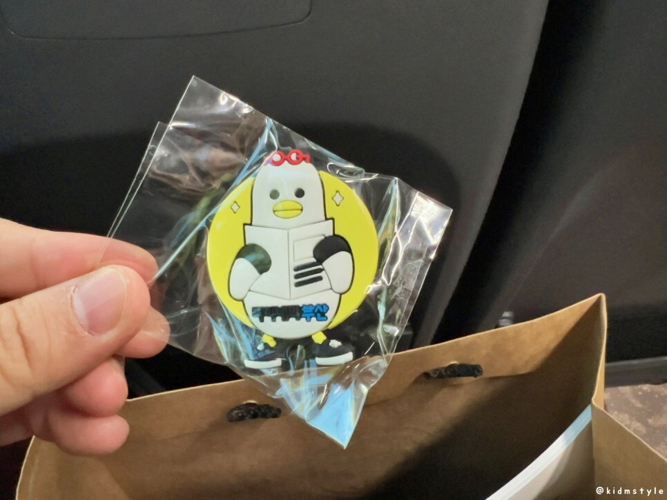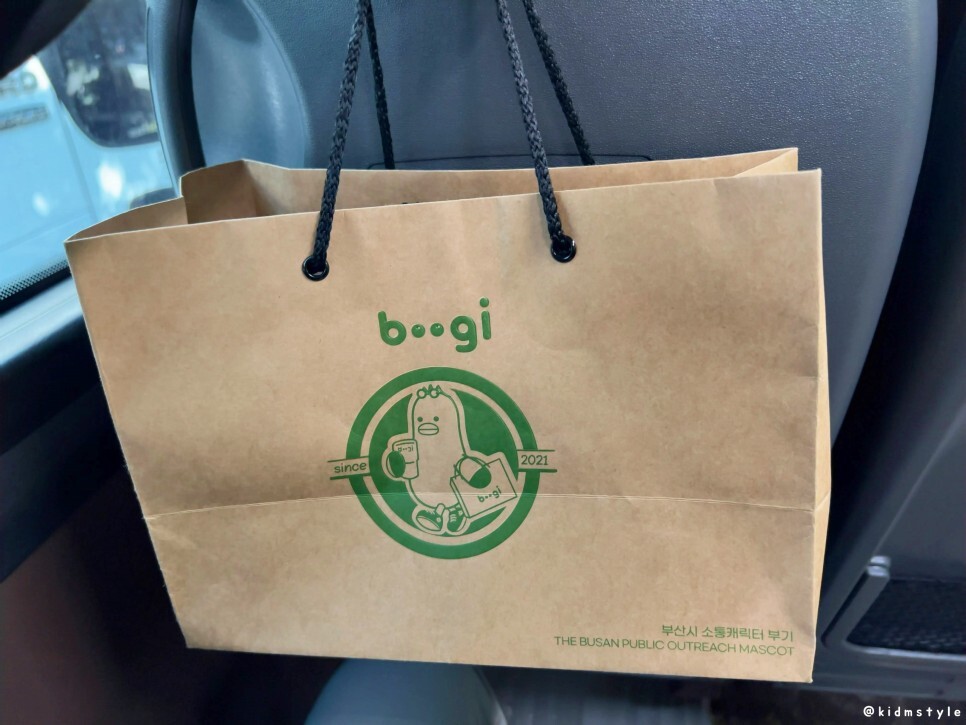 버스에 타면서 부산광역시 소통 캐릭터 부기가 그려진 쇼핑백을 하나씩 받고 자리를 잡고 앉았다.