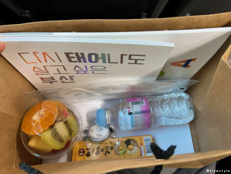 부산광역시를 홍보하는 책자 2권, 컵 과일, 마스크, 생수, 연양갱 등을 챙겨주셨다.