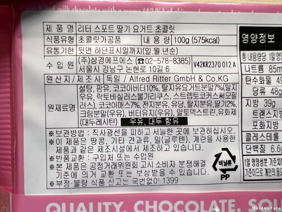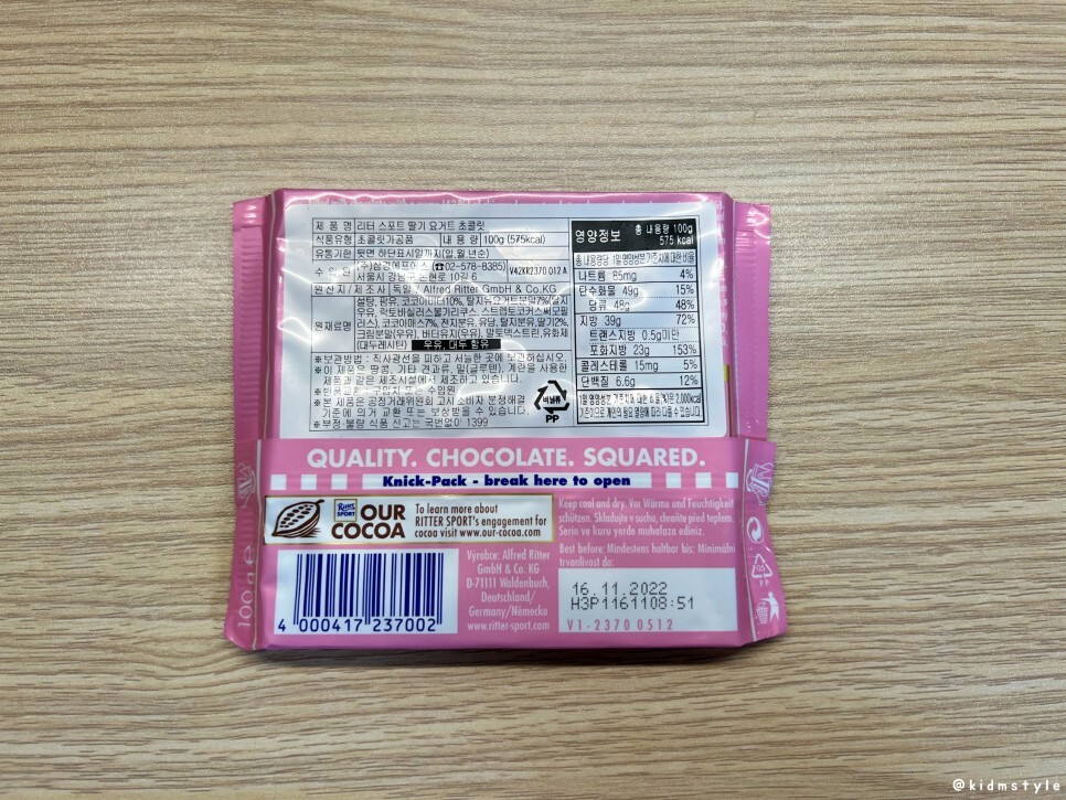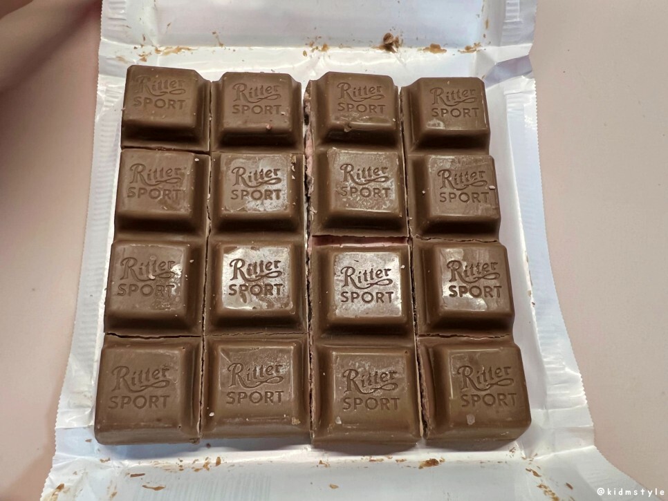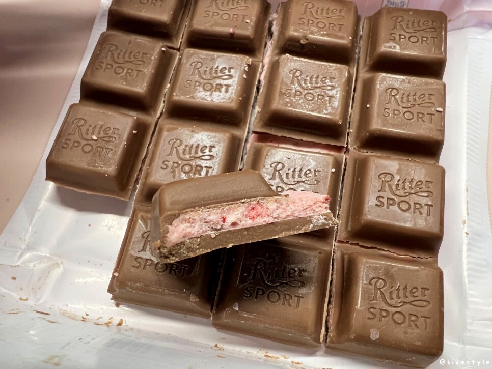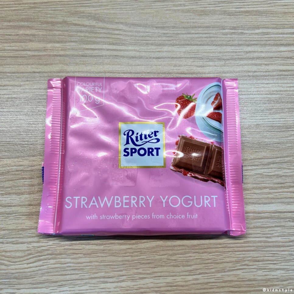 리터 스포트 딸기 요거트 맛 ritter sport strawberry yogurt 딸기맛이라 포장부터 딸기가 생각난다. 가격은 3천 원 후반. 총 10가지가 넘는 맛이 있다고 한다.