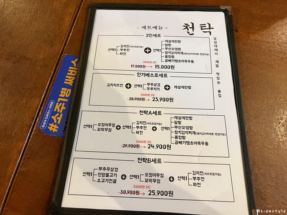 메뉴판을 찍어보았다. 인스타그램에 올리면 소주 1병 서비스를 준다는 것을 이제야 봤네. 이미 술이 됐지만 블로거 정신을 발휘하여 사진이 흔들리지 않게 일단 찍고 보는 이 열정, 본 블로거 스스로 칭찬해 주고 싶다.