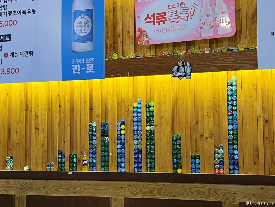 인테리어가 재미있다. 병뚜껑을 쌓을 수 있네. 예전에는 천탁에 오면 커다란 발에 소주 뚜껑을 꼬아서 걸어놓곤 했는데.