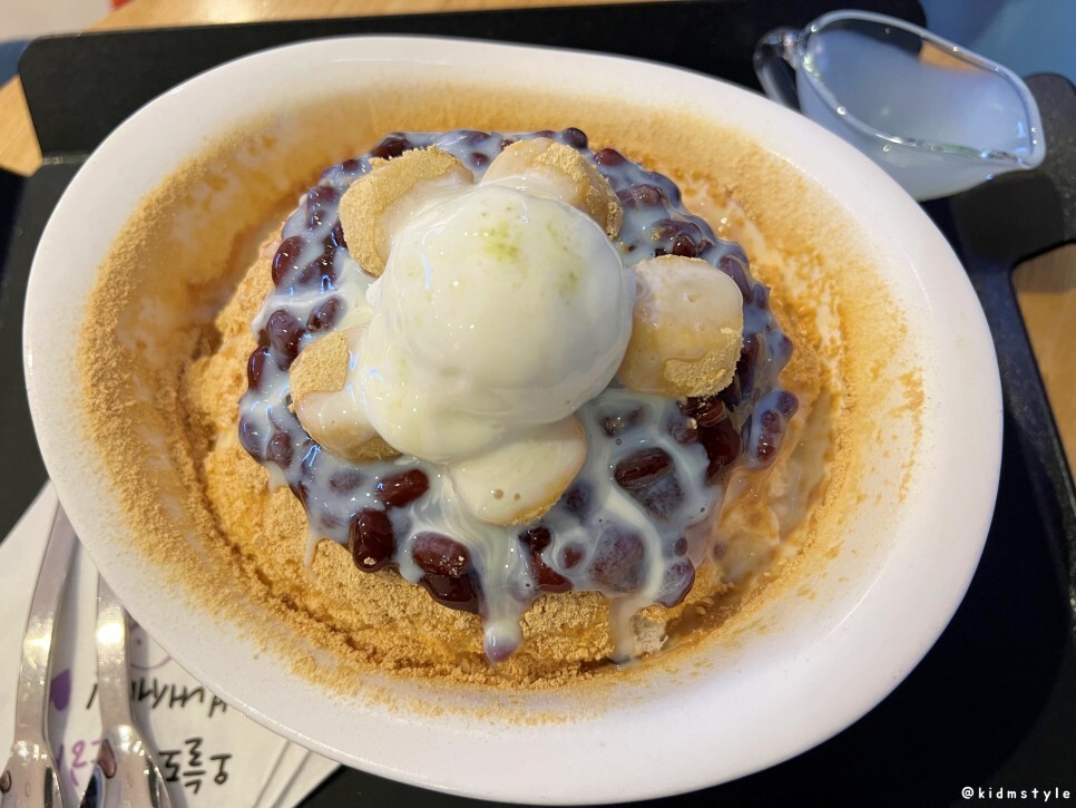 주문한 인절미 빙수가 나왔다. 양도 많고 팥도 있고 인절미도 있고 콩가루도 많다. 좋네. 아이스크림도 한 덩어리 올라간다.