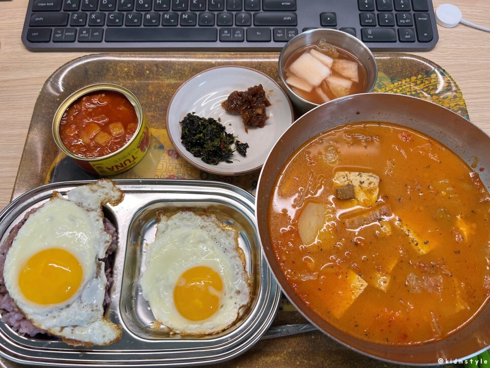 가볍게 반찬을 차리고 김치찌개는 커다란 그릇에 담아왔다. 통후추를 갈아서 올렸다.