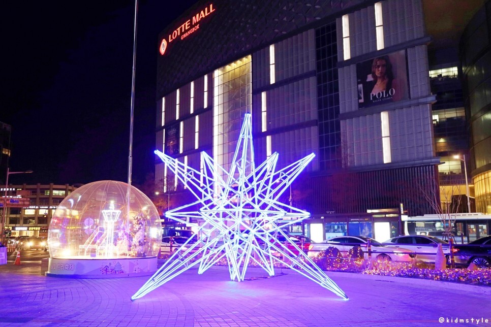 12월 23일 금요일 저녁 퇴근 후 취재를 위해 달려가 보았습니다. 마침 부산의 날씨가 최저 영하 6도에 강풍이 불던 추운 날이라 취재하기에는 수월했답니다. 광복로 입구에 커다란 스노우볼과 눈의 결정을 형상화한 조형물이 트리축제의 시작을 알려줍니다. 스노우볼 안에는 영도대교, 다이아몬드 타워 등 부산을 상징하는 랜드마크로 꾸며져 있었어요.