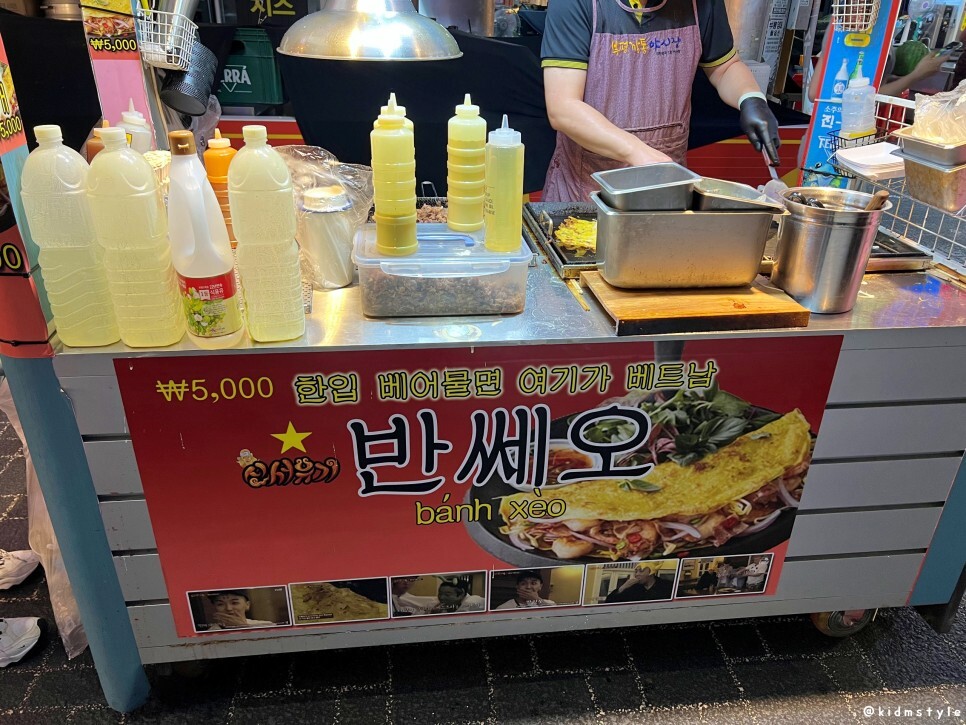 타코야끼를 몇 개 맛보고 반쎄오를 구입하러 가보았다. 베트남에서 맛볼 수 있는 맛있는 반쎄오만큼은 아니겠지만 인기가 많다. 야시장에서 구입할 때 카드 결제는 안되지만 계좌이체로 결제가 가능한 곳들이 꽤 있다.