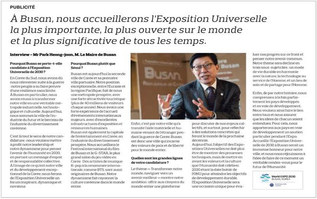 그중에서 '르 피가로'에 실렸던 기사를 가지고 와봤습니다. 세계 10대 신문이자 프랑스 3대 신문으로 알려진 '르 피가로'는 지난 12월 5일 '가장 중요한, 가장 개방적인, 가장 의미 있는 세계박람회를 부산에 개최할 것'이라는 제목으로 부산이 왜 2030세계박람회 유치에 도전하는지, 부산시의 유치 계획 등에 대해 자세하게 보도하였습니다.