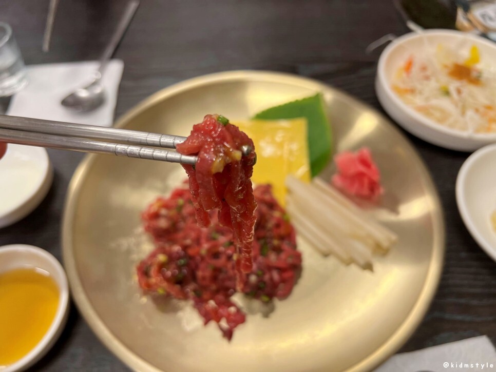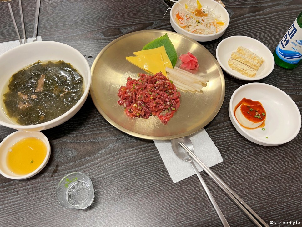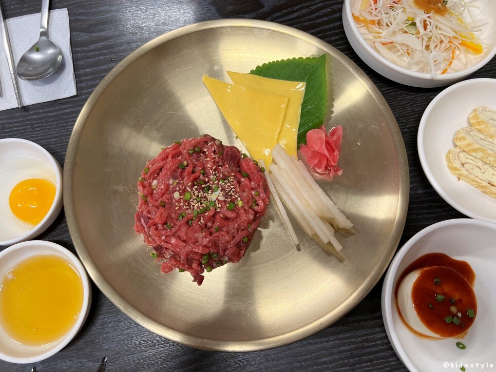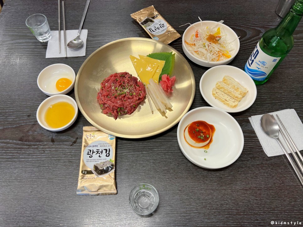 계란 노른자, 소금 기름장 등 내가 원하는 게 기본 제공되니 좋다. 따로 요청을 해야 주는 집들도 많다. 심지어 김을 주지 않는 육회집도 있더라.