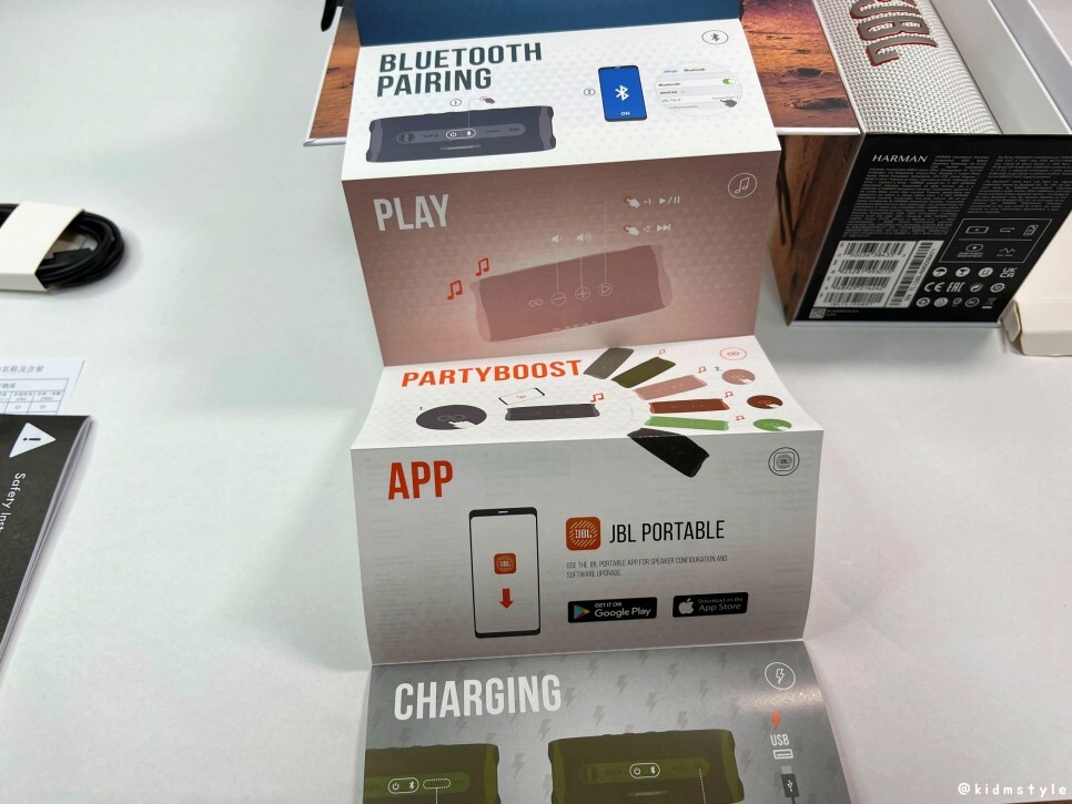 JBL 블루투스 스피커에는 여러 가지 제품 라인이 있는데 플립, 차지, 익스트림, 붐박스, 파티박스의 순이다. 플립이 가장 작고 뒤로 갈수록 크기가 커진다. 파티박스는 크기가 노래방 기계 정도로 크다.