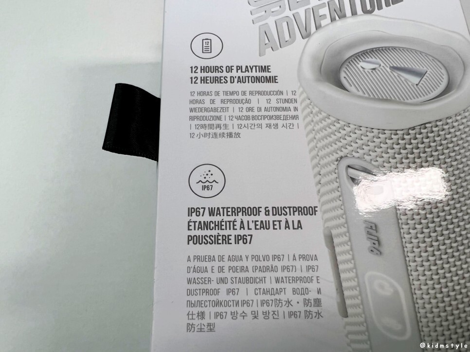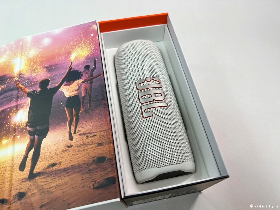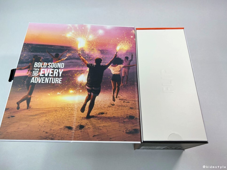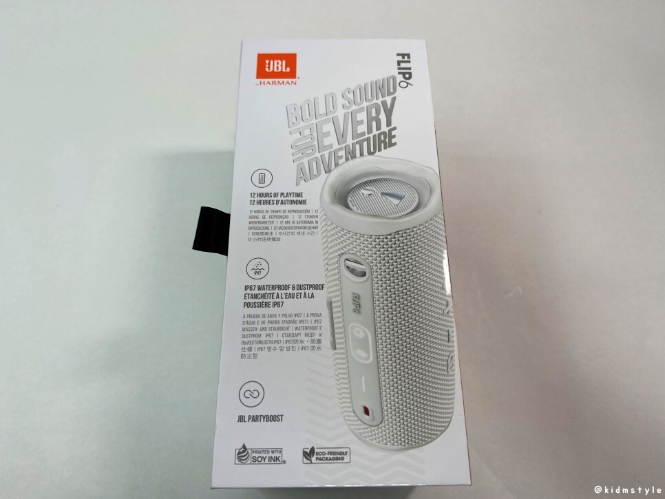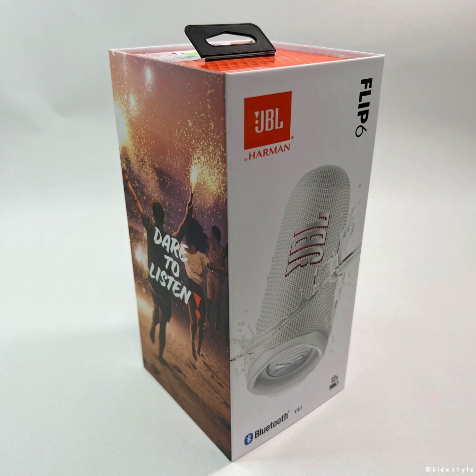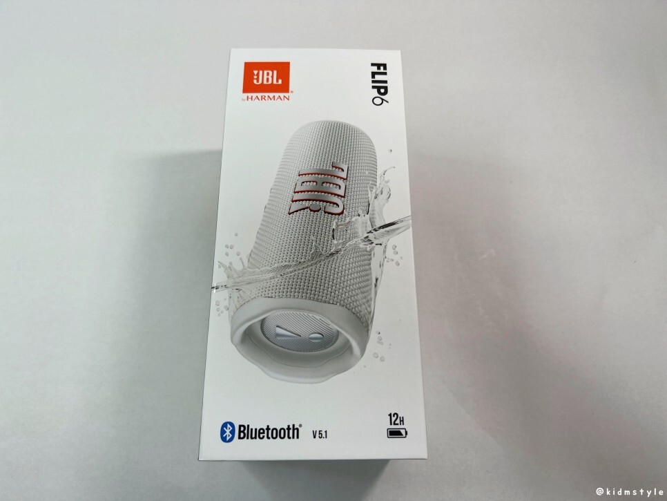 플립6의 가격은 14만 원대이다. 상자에 제품의 특징이 나와있는데 방수가 되는 제품이며 블루투스 v5.1, 12시간 재생이 가능하다.