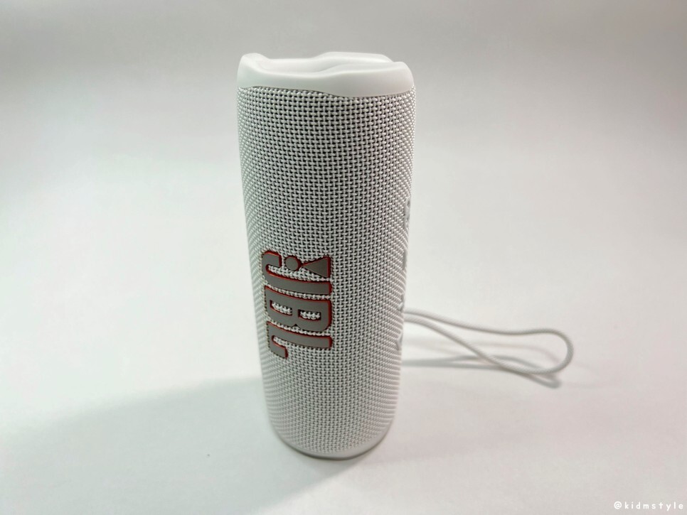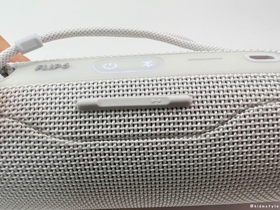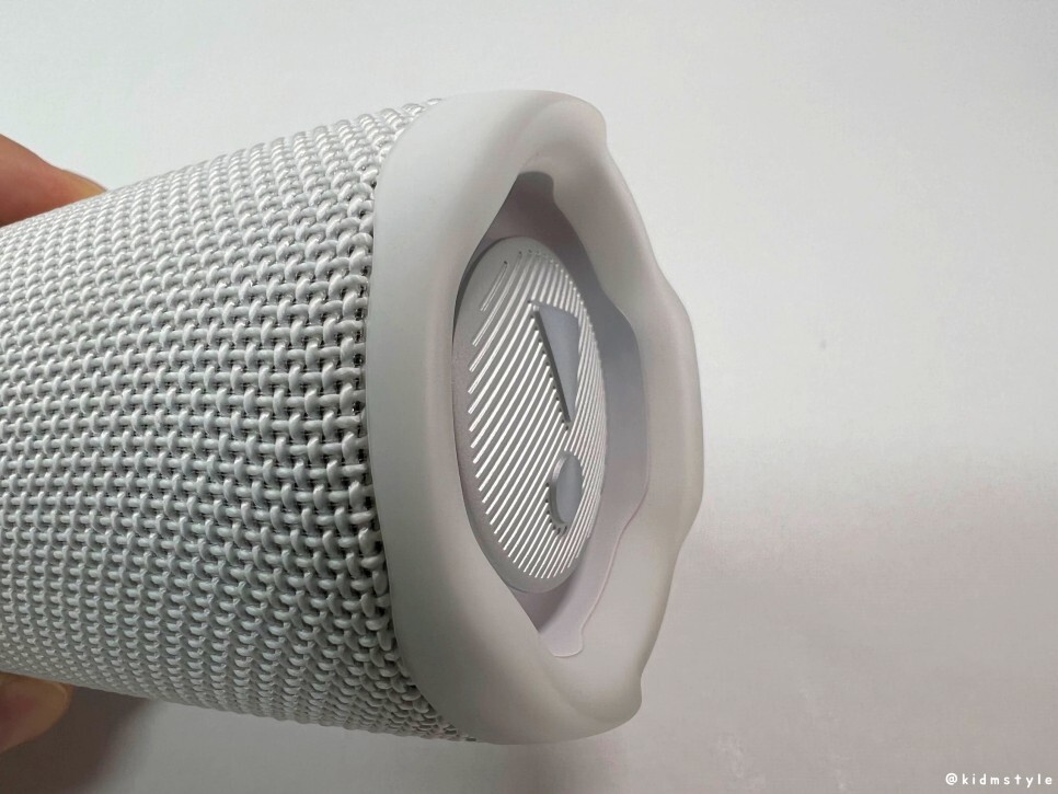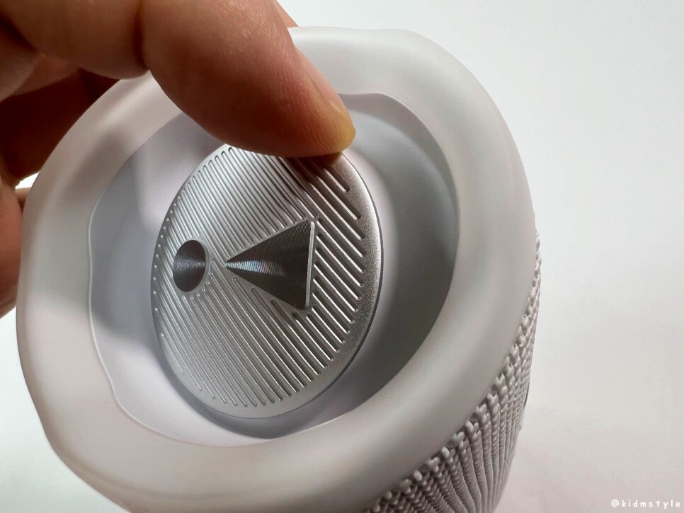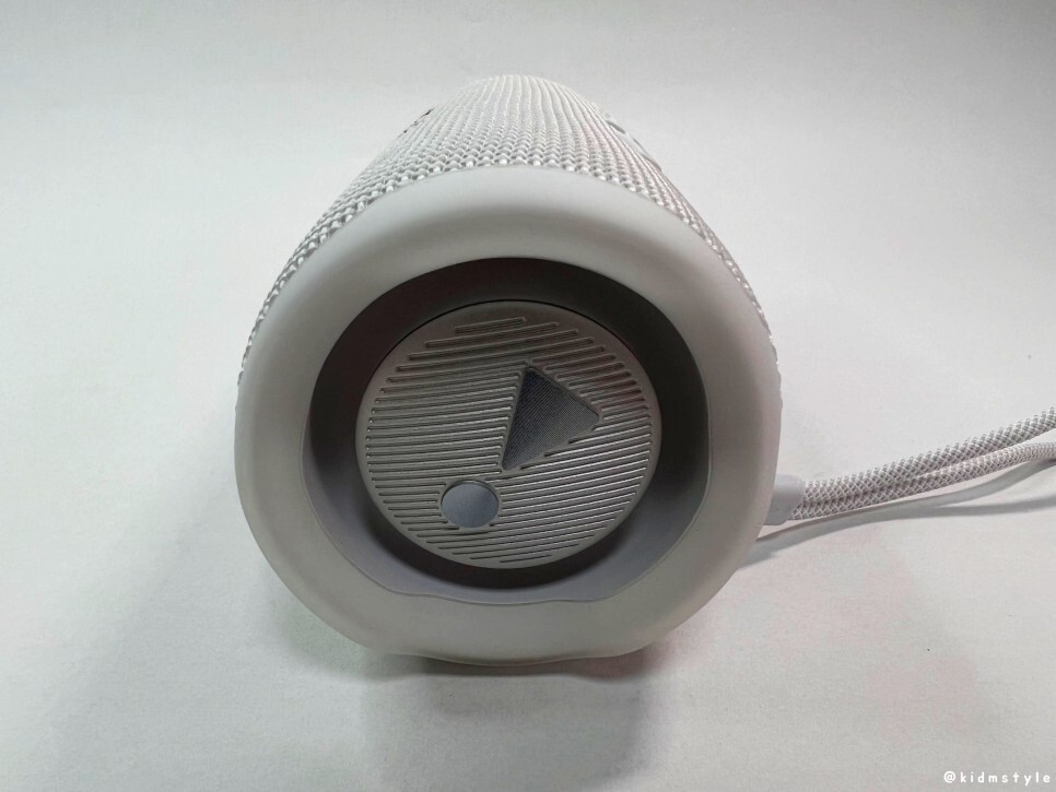 전원 버튼 밑에 돌출된 고무 재질이 보이는데 특별한 기능은 없고 스피커를 가로로 놓았을 때 더 이상 굴러가지 않게 하는 역할을 한다.